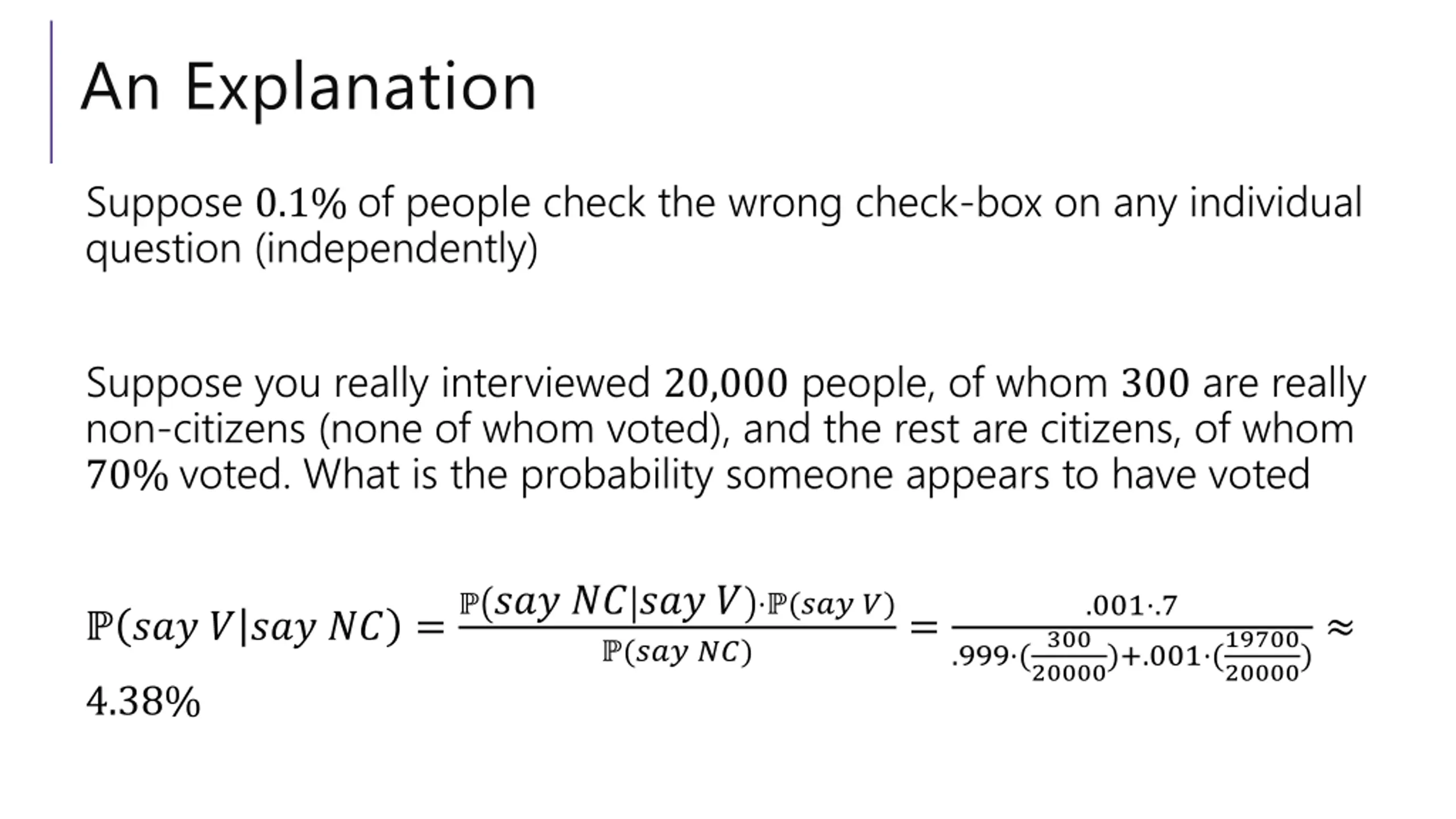 An Explanation Suppose 0.1% of people check the wrong check-box on any individual question (independently) Suppose you really interviewed 20,000 people, of whom 300 are really non-citizens (none of whom voted), and the rest are citizens, of whom 70% voted. What is the probability someone appears to have voted ??? ?? ??? ? (??? ?) (??? ??) .001 .7 300 20000)+.001 (19700 ??? ? ??? ?? = = 20000) .999 ( 4.38%