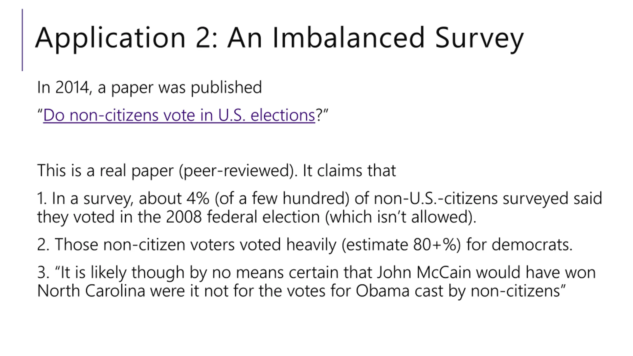 Application 2: An Imbalanced Survey In 2014, a paper was published Do non-citizens vote in U.S. elections? This is a real paper (peer-reviewed). It claims that 1. In a survey, about 4% (of a few hundred) of non-U.S.-citizens surveyed said they voted in the 2008 federal election (which isn t allowed). 2. Those non-citizen voters voted heavily (estimate 80+%) for democrats. 3. It is likely though by no means certain that John McCain would have won North Carolina were it not for the votes for Obama cast by non-citizens