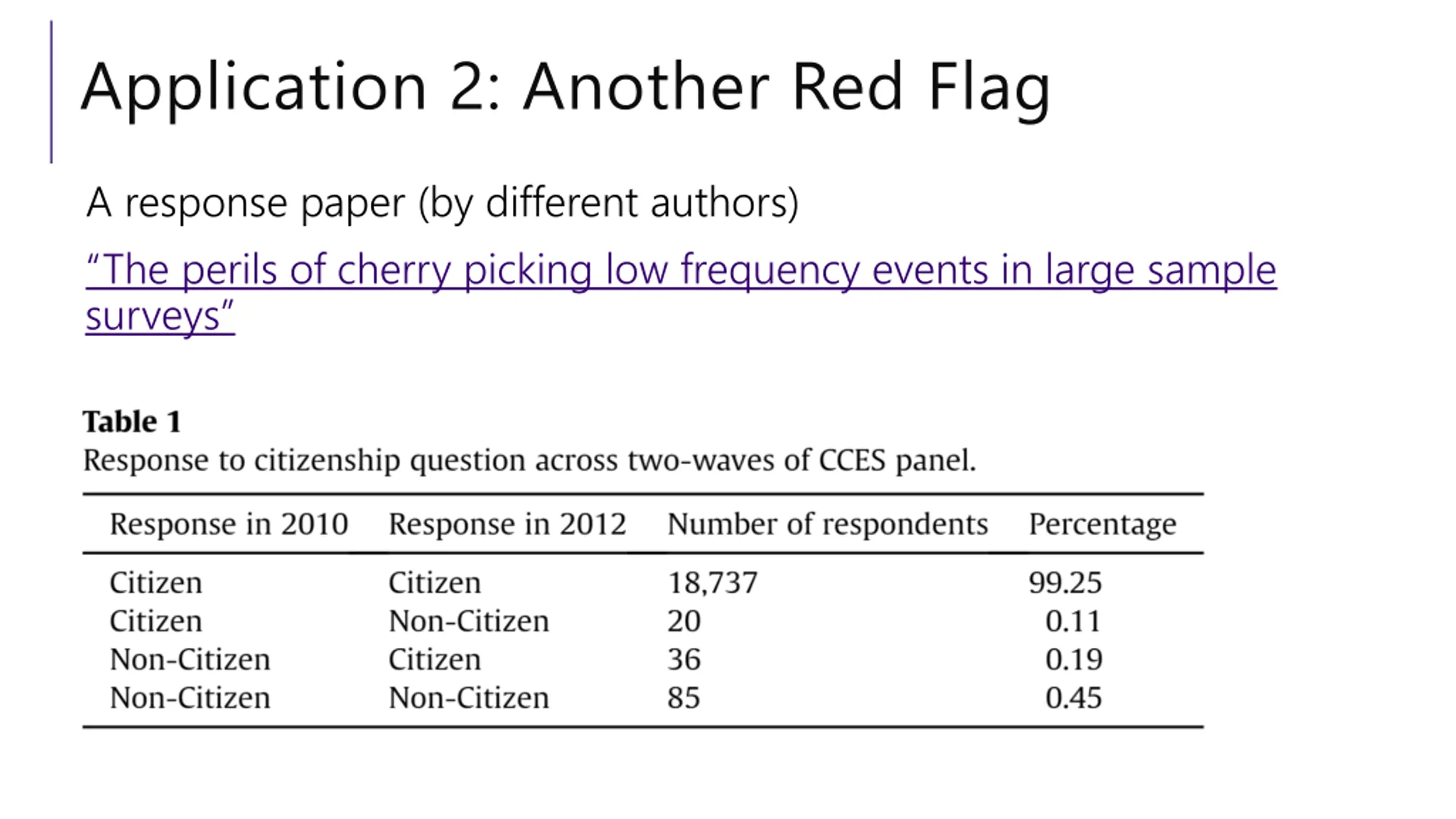Application 2: Another Red Flag A response paper (by different authors) The perils of cherry picking low frequency events in large sample surveys