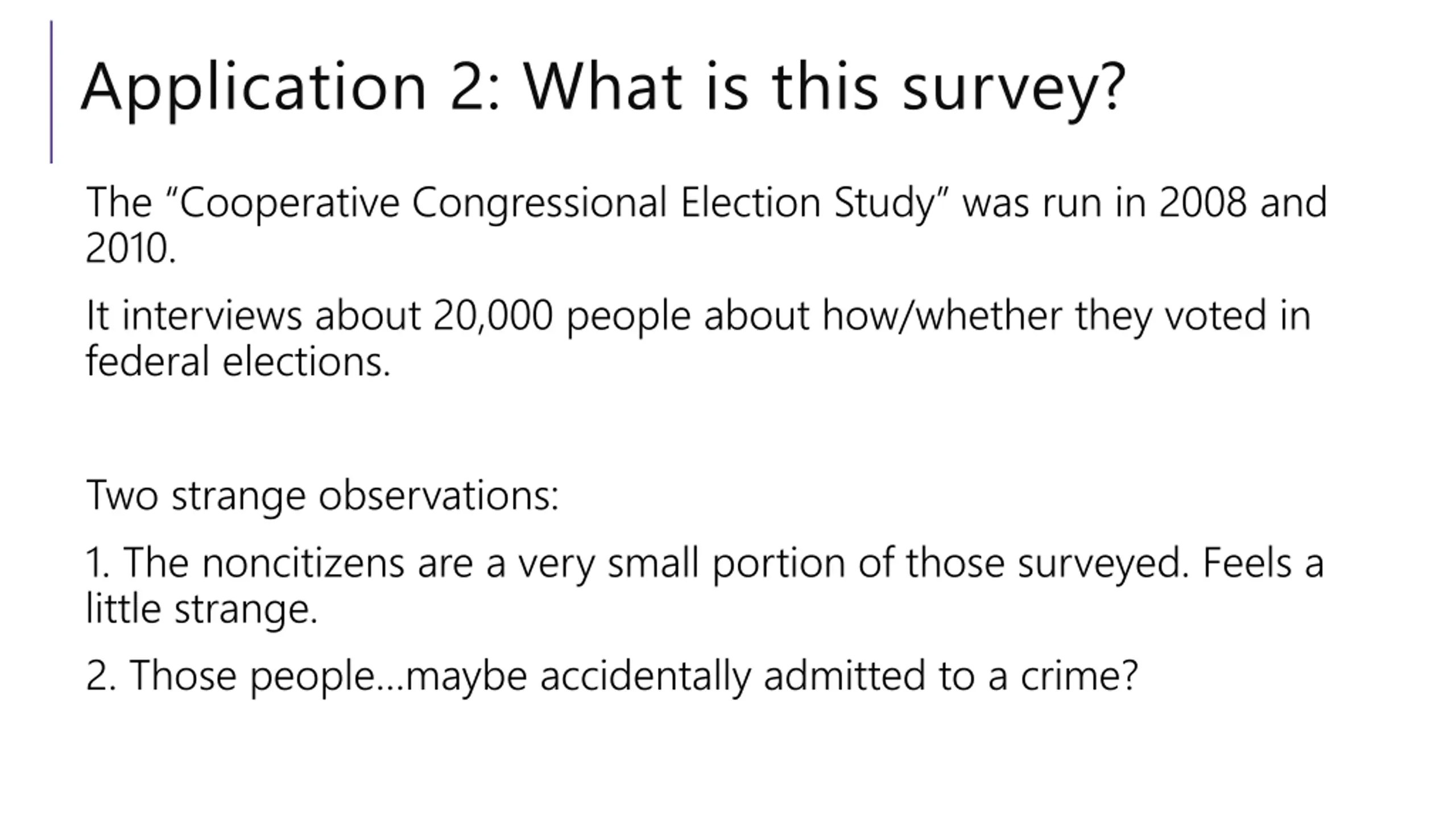 Application 2: What is this survey? The Cooperative Congressional Election Study was run in 2008 and 2010. It interviews about 20,000 people about how/whether they voted in federal elections. Two strange observations: 1. The noncitizens are a very small portion of those surveyed. Feels a little strange. 2. Those people maybe accidentally admitted to a crime?