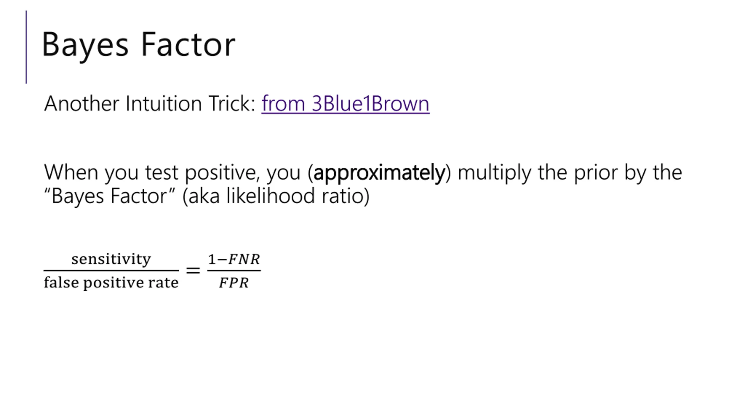 Bayes Factor Another Intuition Trick: from 3Blue1Brown from 3Blue1Brown When you test positive, you (approximately Bayes Factor (aka likelihood ratio) approximately) multiply the prior by the sensitivity false positive rate=1 ??? ???