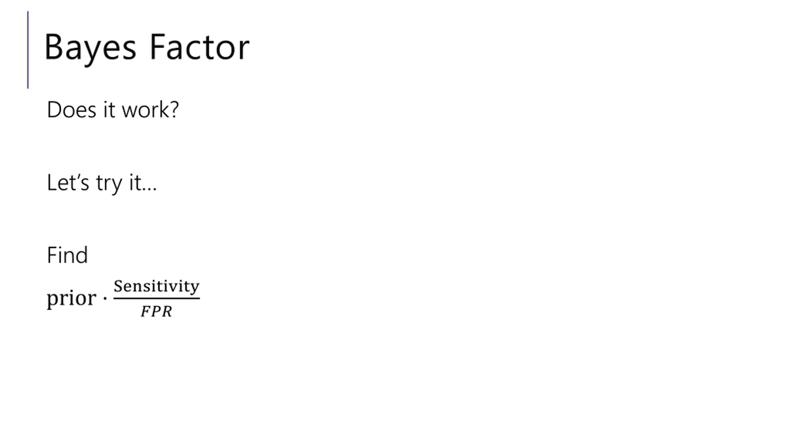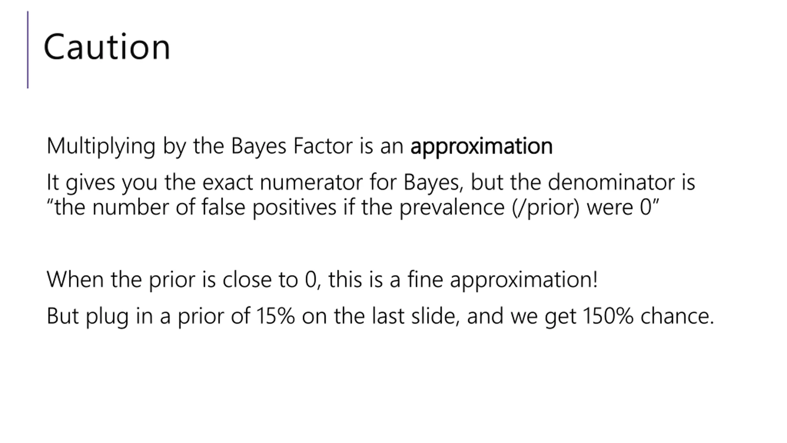 Caution Multiplying by the Bayes Factor is an approximation It gives you the exact numerator for Bayes, but the denominator is the number of false positives if the prevalence (/prior) were 0 approximation When the prior is close to 0, this is a fine approximation! But plug in a prior of 15% on the last slide, and we get 150% chance.