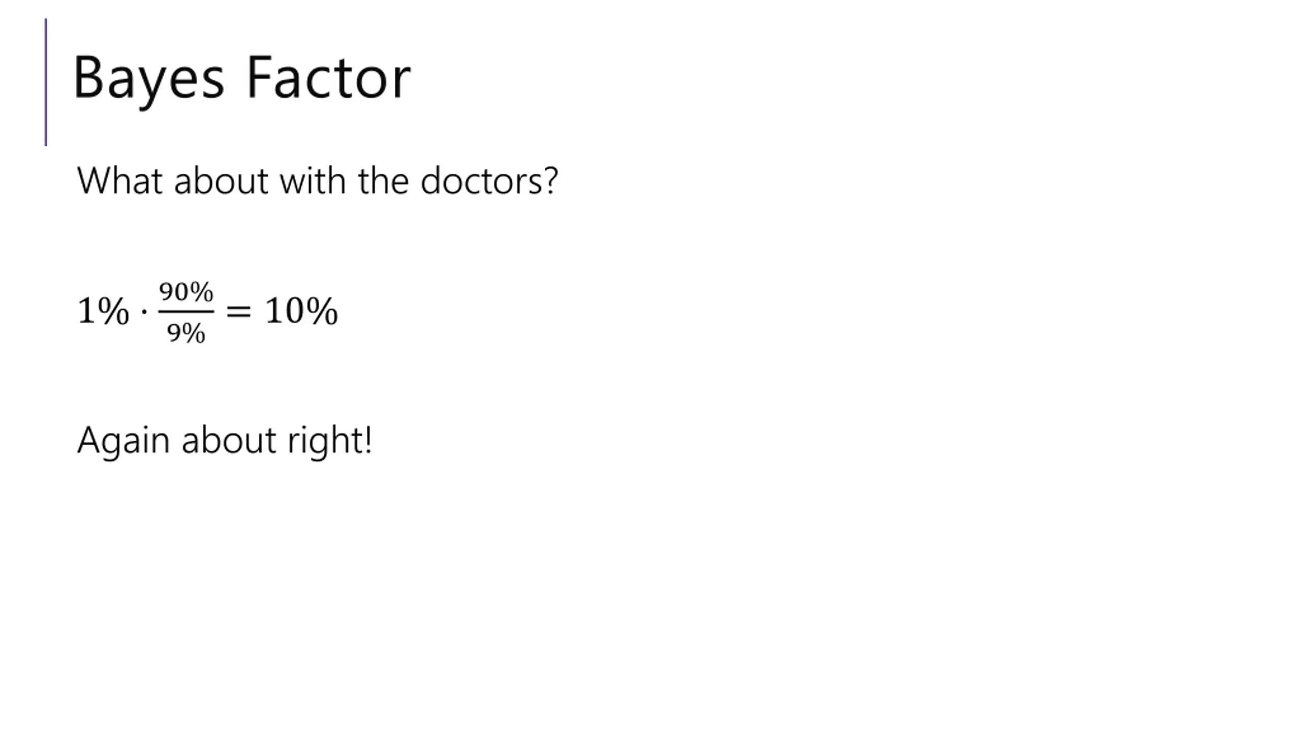 Bayes Factor What about with the doctors? 1% 90% 9%= 10% Again about right!