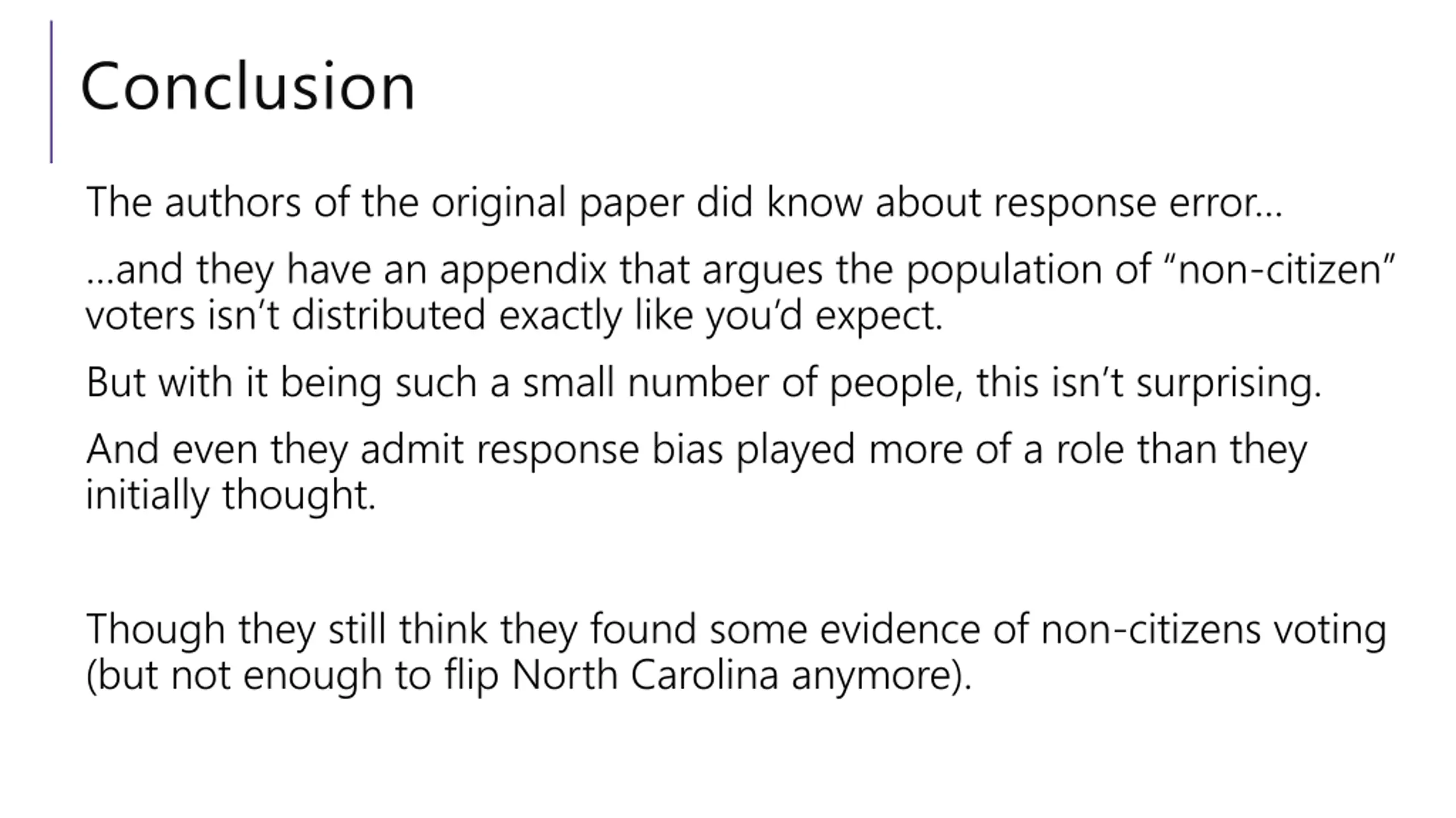 Conclusion The authors of the original paper did know about response error and they have an appendix that argues the population of non-citizen voters isn t distributed exactly like you d expect. But with it being such a small number of people, this isn t surprising. And even they admit response bias played more of a role than they initially thought. Though they still think they found some evidence of non-citizens voting (but not enough to flip North Carolina anymore).