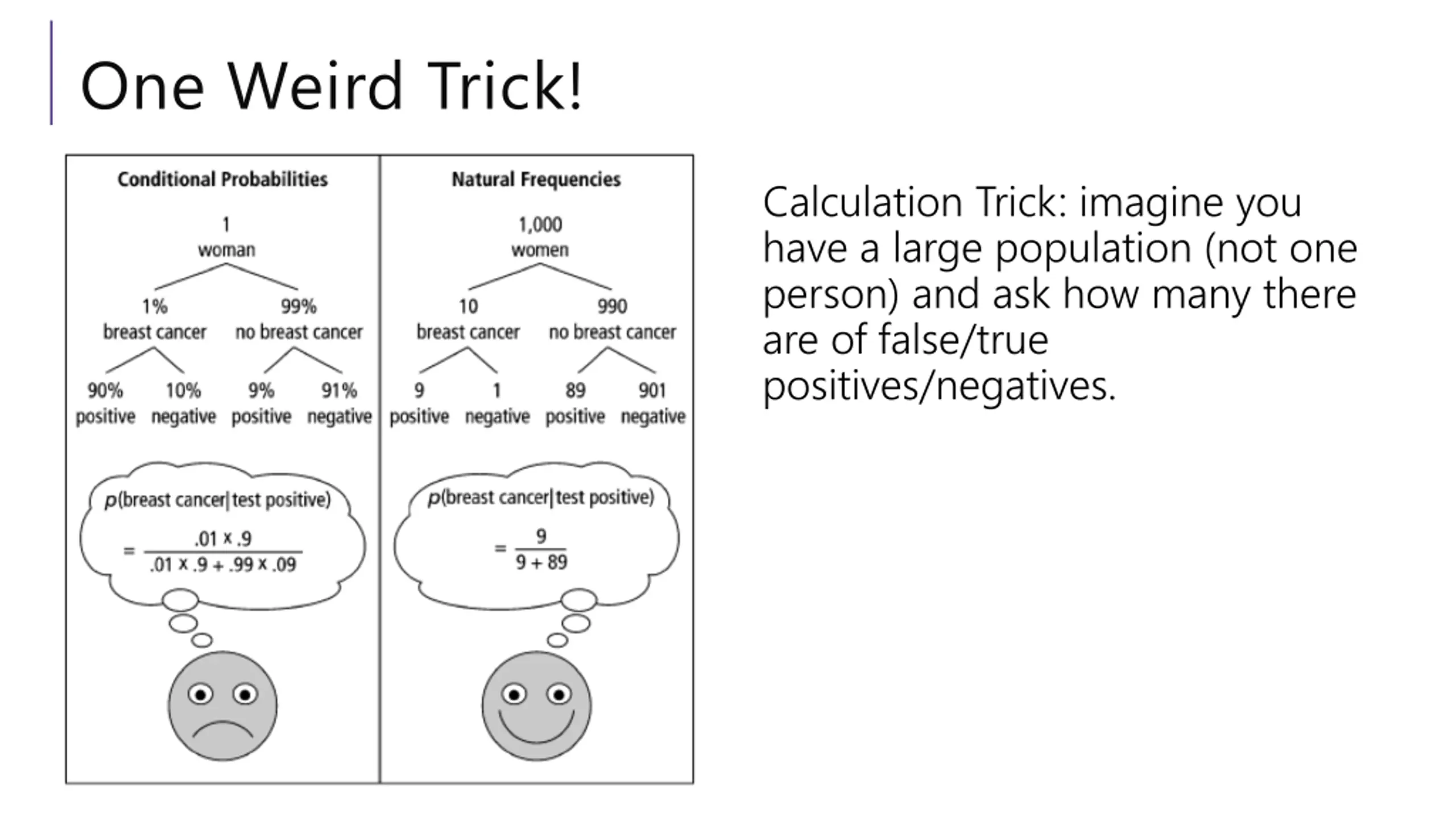 One Weird Trick! Calculation Trick: imagine you have a large population (not one person) and ask how many there are of false/true positives/negatives.