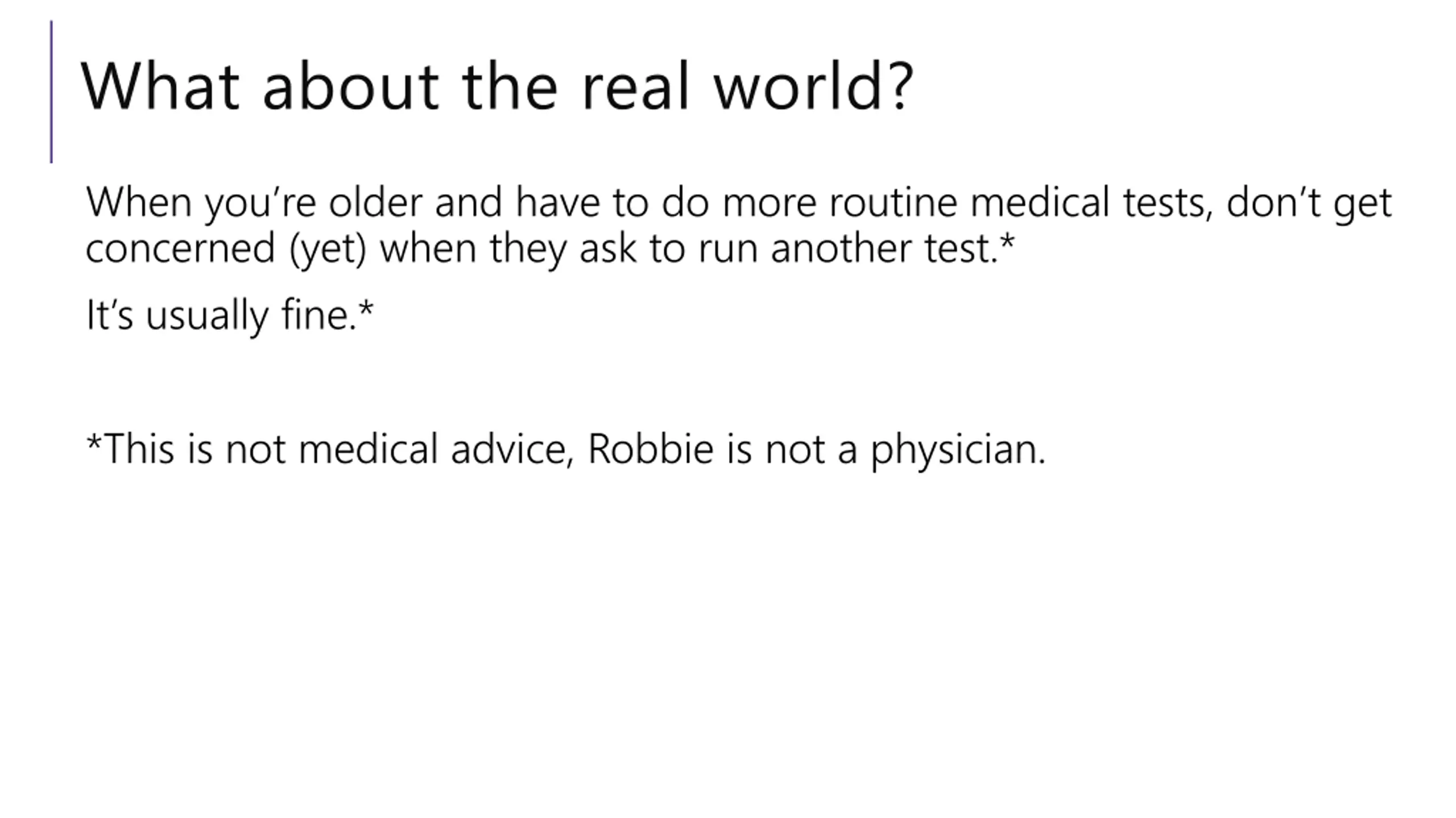What about the real world? When you re older and have to do more routine medical tests, don t get concerned (yet) when they ask to run another test.* It s usually fine.* *This is not medical advice, Robbie is not a physician.