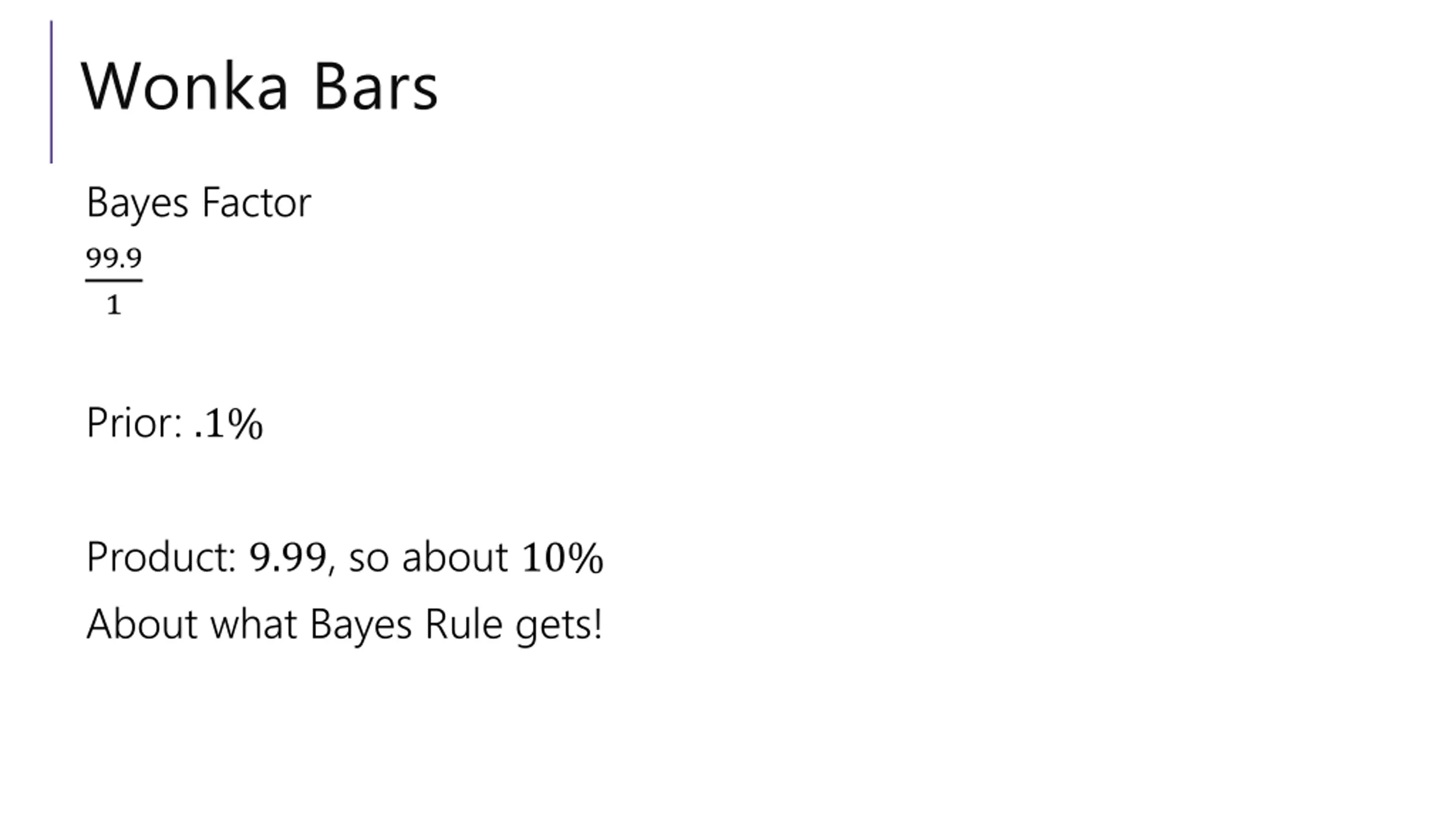 Wonka Bars Bayes Factor 99.9 1 Prior: .1% Product: 9.99, so about 10% About what Bayes Rule gets!