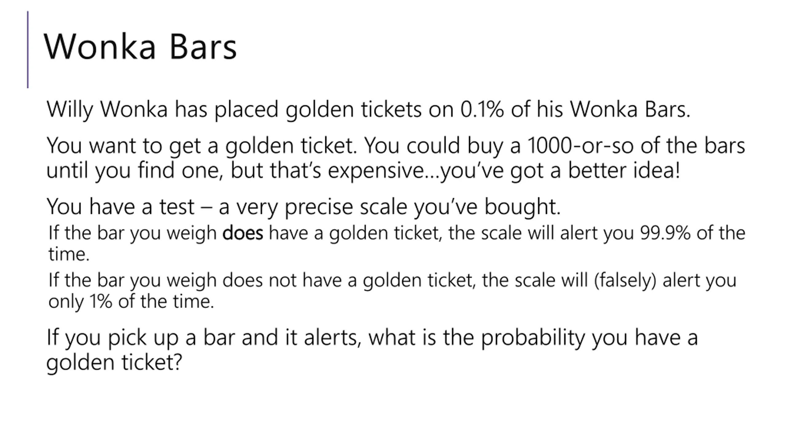 Wonka Bars Willy Wonka has placed golden tickets on 0.1% of his Wonka Bars. You want to get a golden ticket. You could buy a 1000-or-so of the bars until you find one, but that s expensive you ve got a better idea! You have a test a very precise scale you ve bought. If the bar you weigh does does have a golden ticket, the scale will alert you 99.9% of the time. If the bar you weigh does not have a golden ticket, the scale will (falsely) alert you only 1% of the time. If you pick up a bar and it alerts, what is the probability you have a golden ticket?