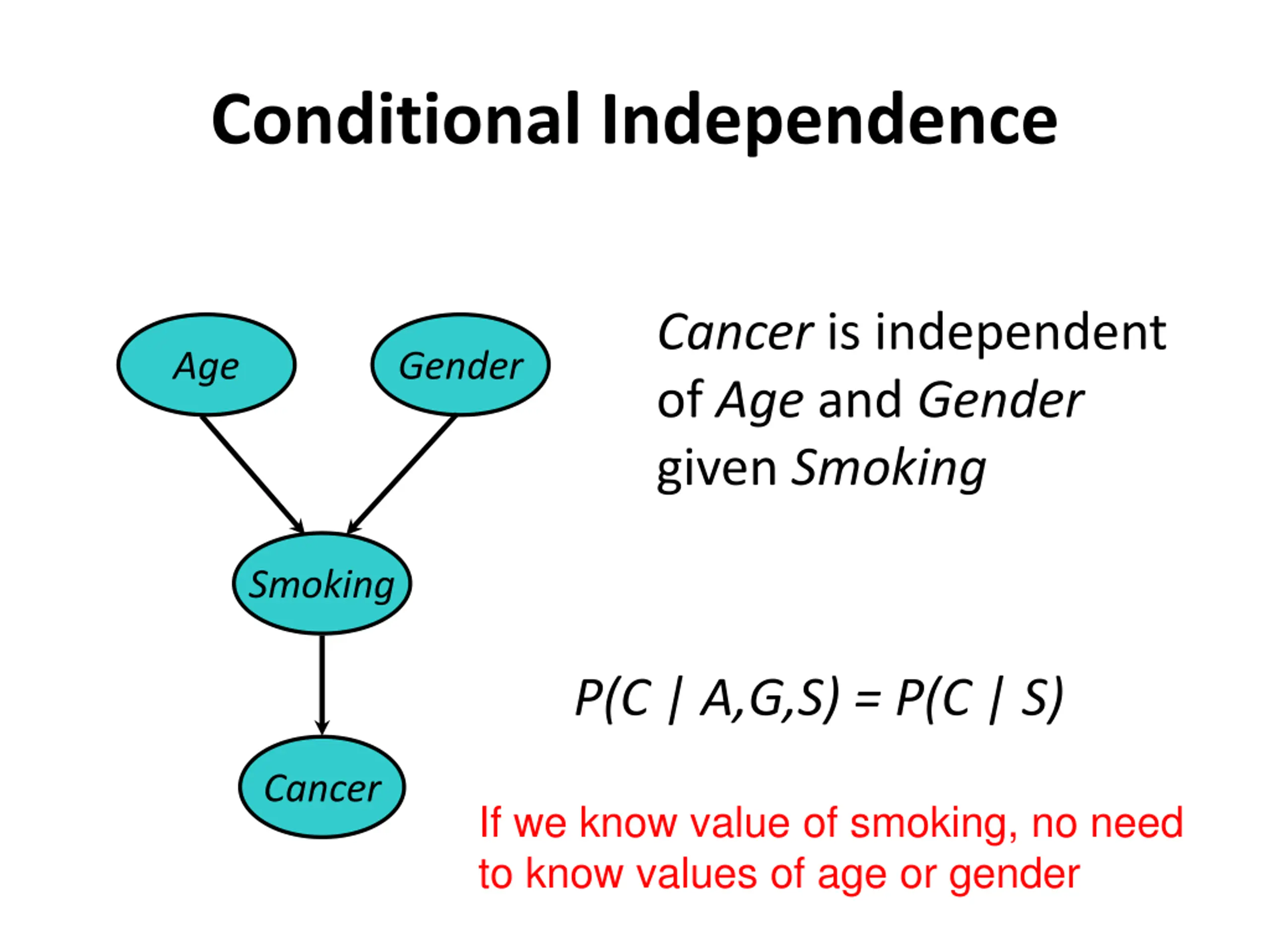 Conditional Independence Cancer is independent of Age and Gender given Smoking Age Gender Smoking P(C | A,G,S) = P(C | S) Cancer If we know value of smoking, no need to know values of age or gender
