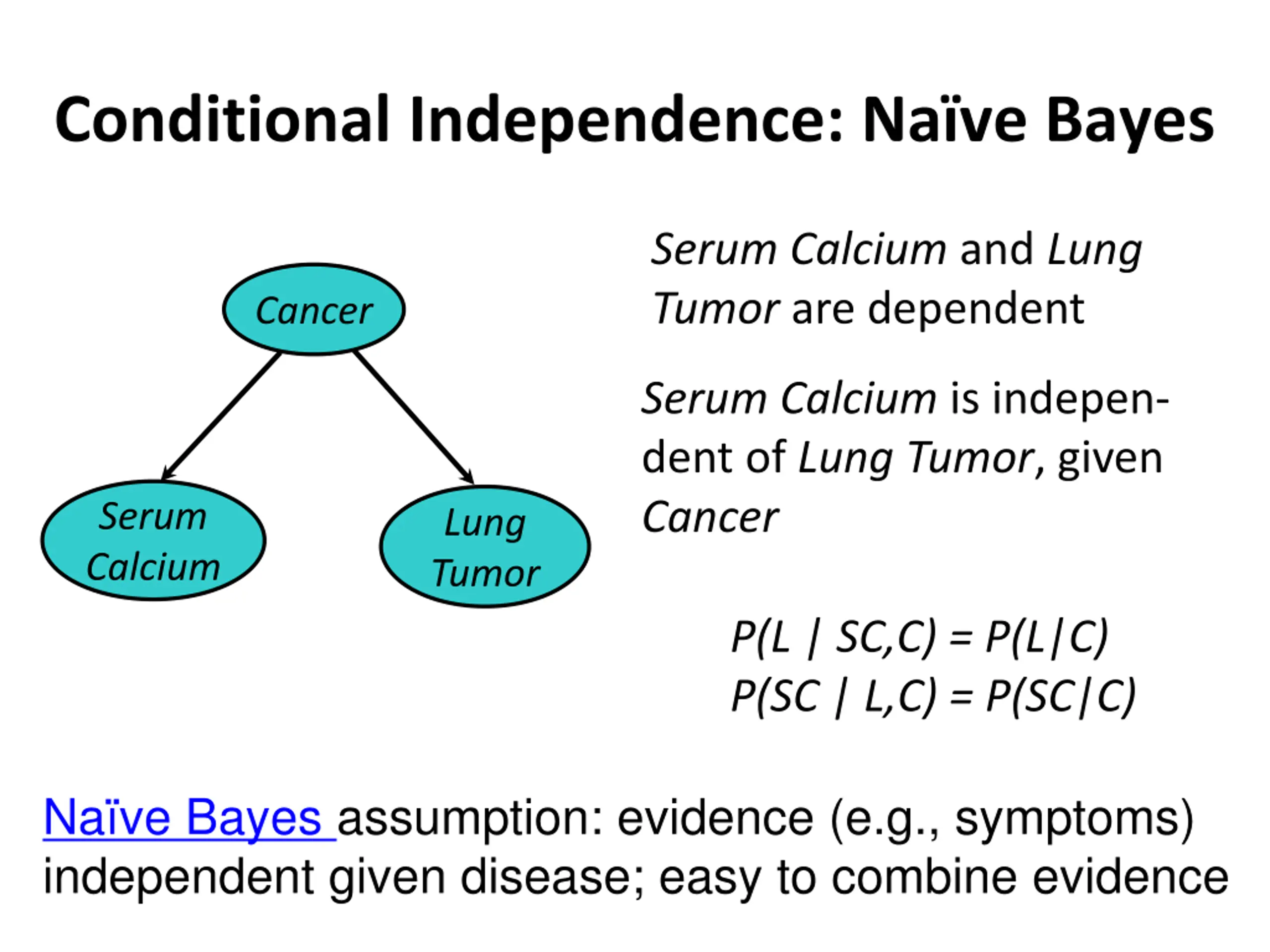 Conditional Independence: Nave Bayes Serum Calcium and Lung Tumor are dependent Cancer Serum Calcium is indepen- dent of Lung Tumor, given Cancer Serum Calcium Lung Tumor P(L | SC,C) = P(L|C) P(SC | L,C) = P(SC|C) Na ve Bayes assumption: evidence (e.g., symptoms) independent given disease; easy to combine evidence