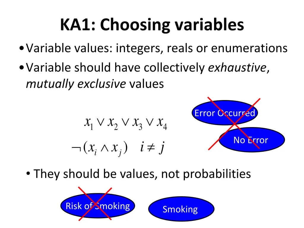 KA1: Choosing variables Variable values: integers, reals or enumerations Variable should have collectively exhaustive, mutually exclusive values Error Occurred x x x x 1 x 2 3 i 4 No Error ( ) x j i j They should be values, not probabilities Risk of Smoking Smoking