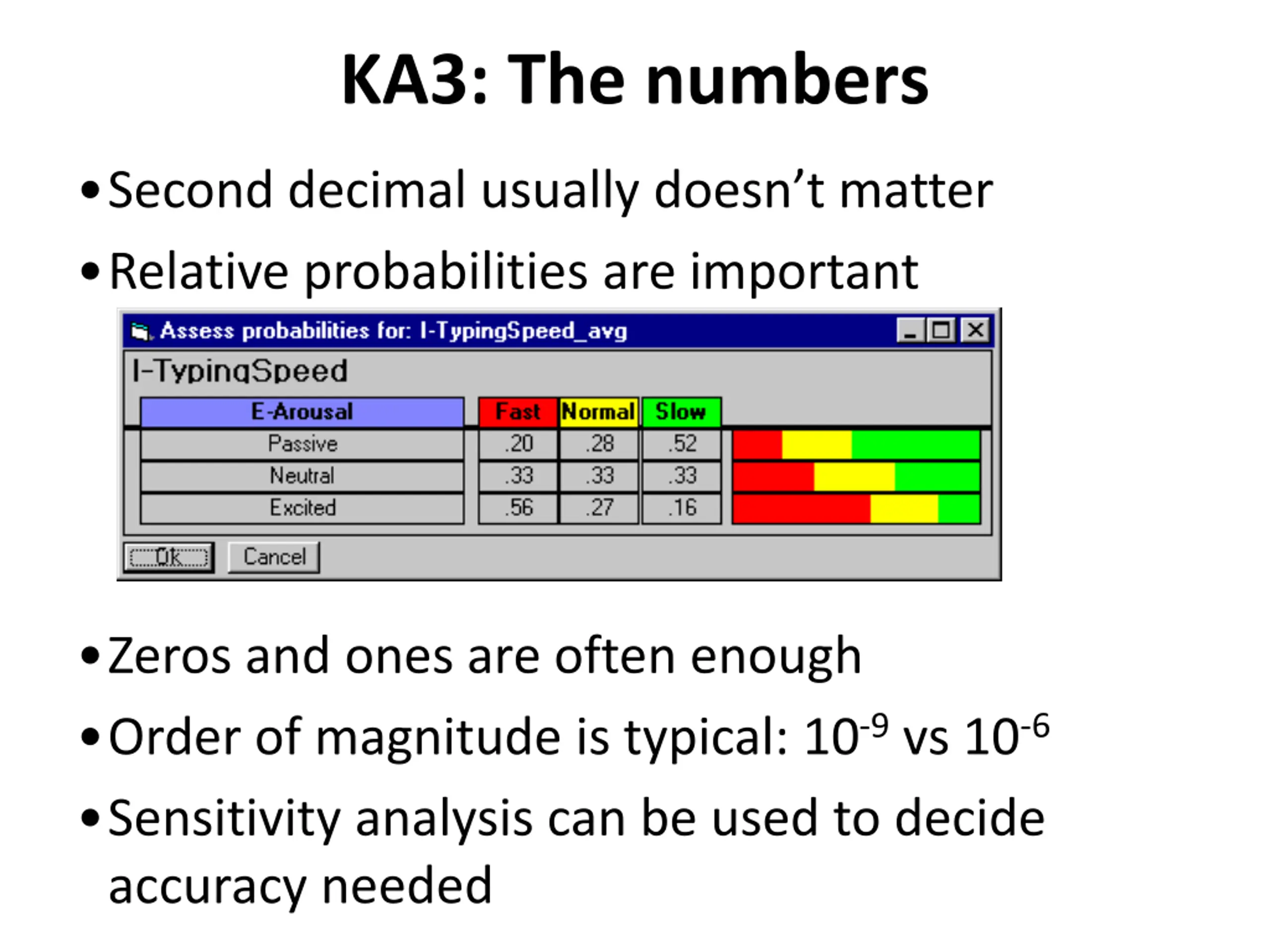 KA3: The numbers Second decimal usually doesn t matter Relative probabilities are important Zeros and ones are often enough Order of magnitude is typical: 10-9 vs 10-6 Sensitivity analysis can be used to decide accuracy needed