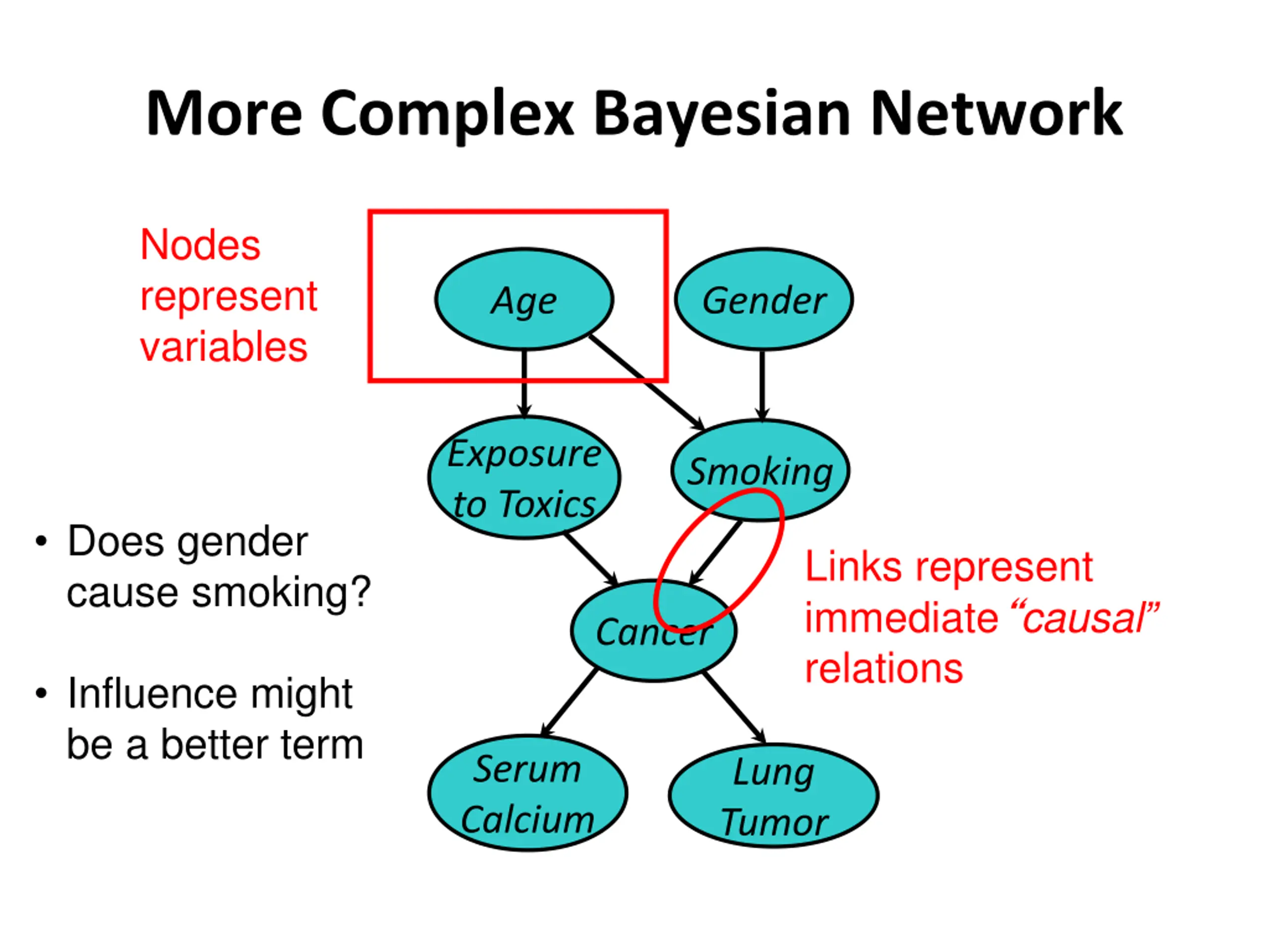 More Complex Bayesian Network Nodes represent variables Age Gender Exposure to Toxics Smoking Does gender cause smoking? Links represent immediate causal relations Cancer Influence might be a better term Serum Calcium Lung Tumor