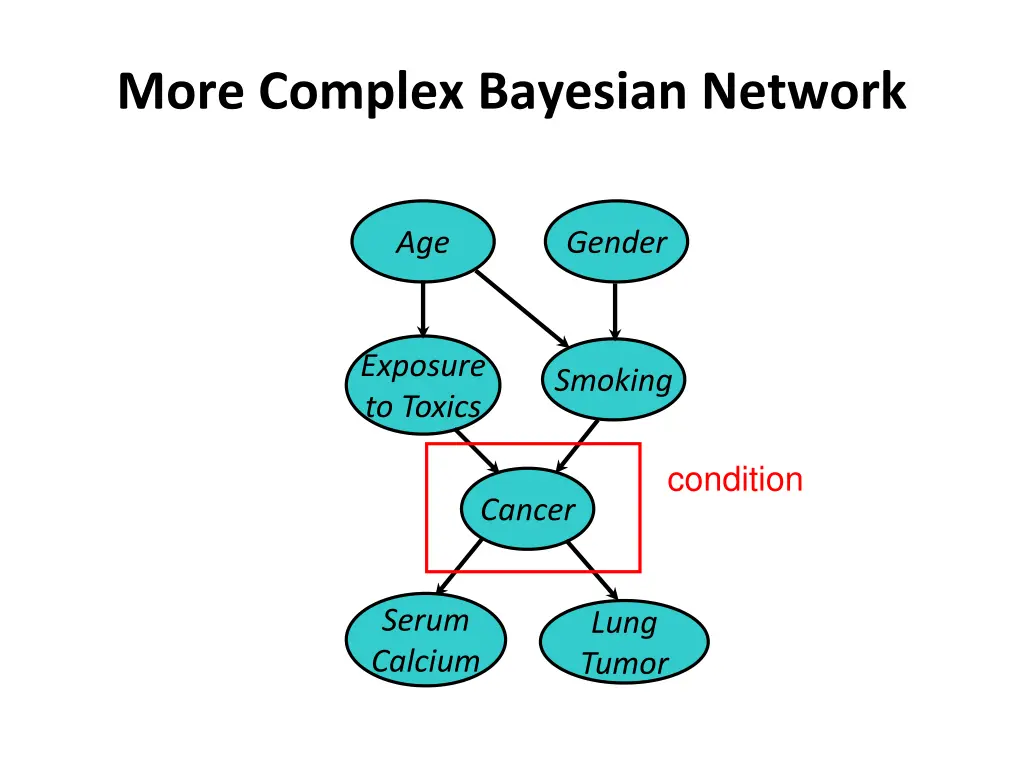 More Complex Bayesian Network Age Gender Exposure to Toxics Smoking condition Cancer Serum Calcium Lung Tumor