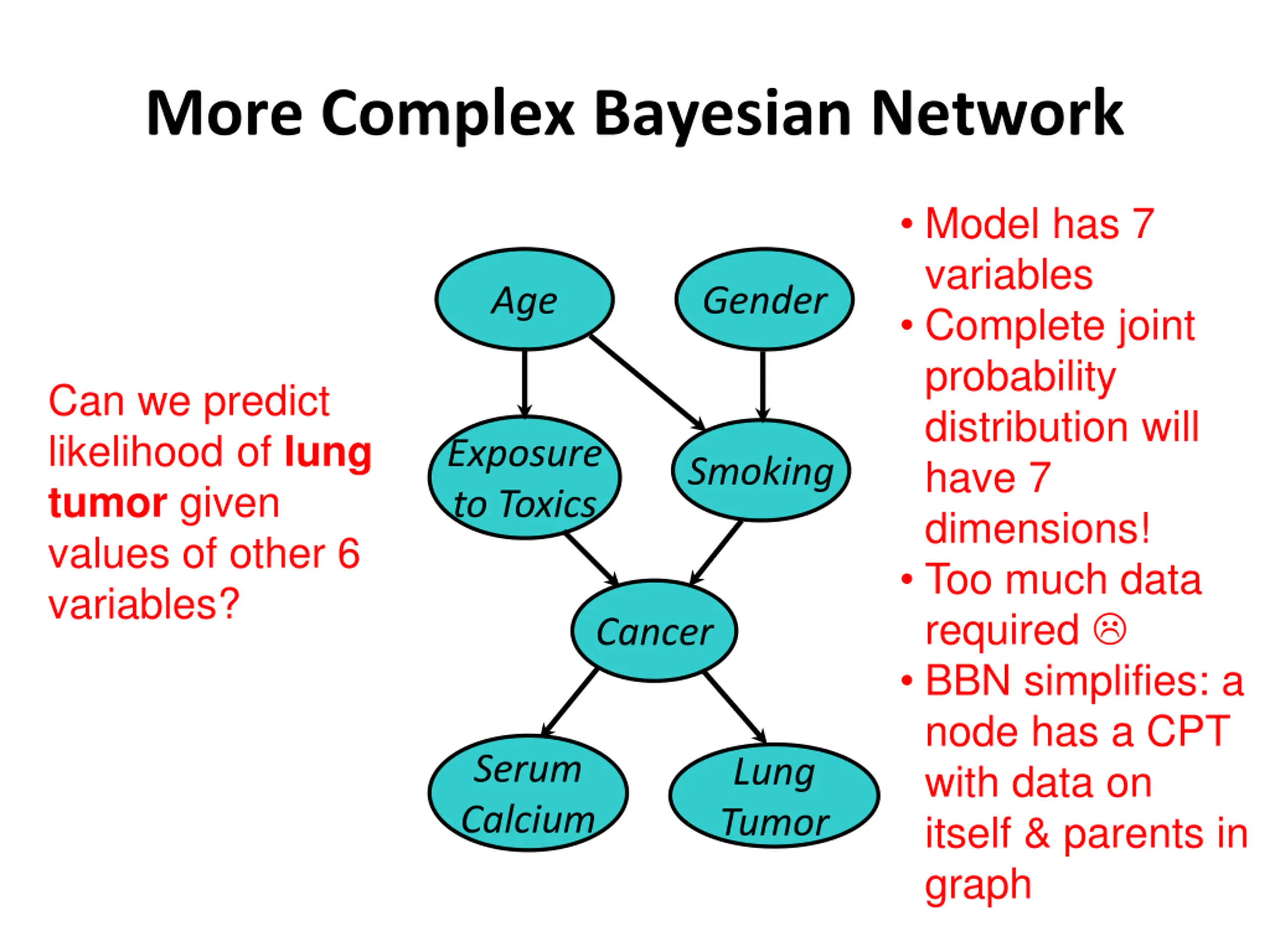 More Complex Bayesian Network Model has 7 variables Complete joint probability distribution will have 7 dimensions! Too much data required BBN simplifies: a node has a CPT with data on itself & parents in graph Age Gender Can we predict likelihood of lung tumor given values of other 6 variables? Exposure to Toxics Smoking Cancer Serum Calcium Lung Tumor
