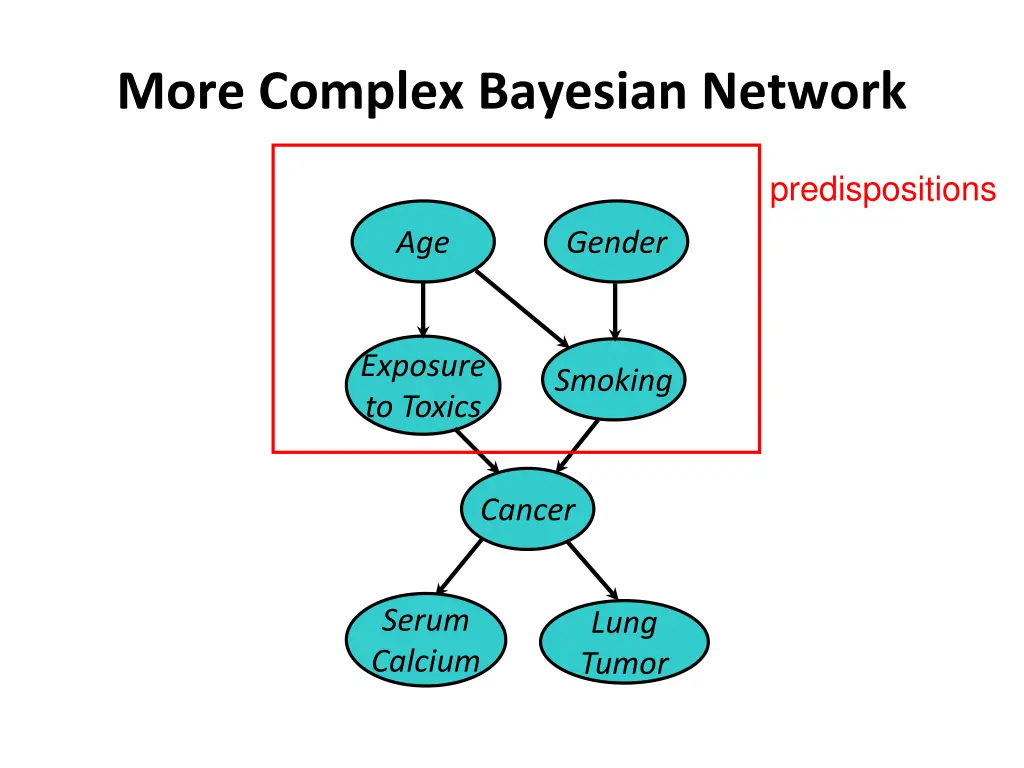 More Complex Bayesian Network predispositions Age Gender Exposure to Toxics Smoking Cancer Serum Calcium Lung Tumor