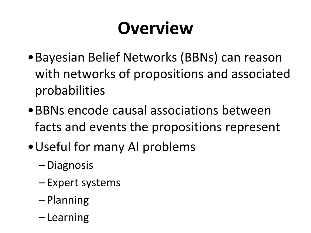 Overview Bayesian Belief Networks (BBNs) can reason with networks of propositions and associated probabilities BBNs encode causal associations between facts and events the propositions represent Useful for many AI problems Diagnosis Expert systems Planning Learning
