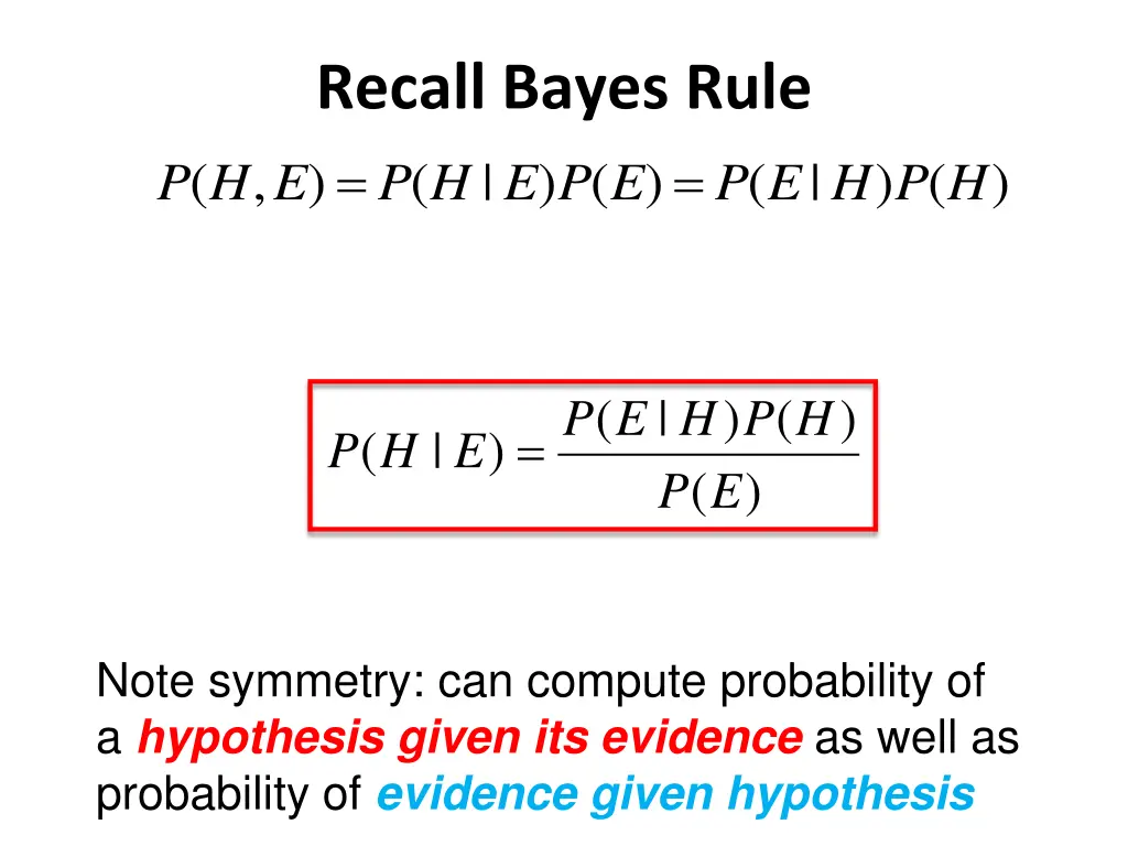 Recall Bayes Rule ) | ( ) P E H P = = ( , ( ) ( | ) ( ) P H E E P E H P H ( | P ) ( ) P E H P H = ( | ) P H E ( ) E Note symmetry: can compute probability of a hypothesis given its evidence as well as probability of evidence given hypothesis