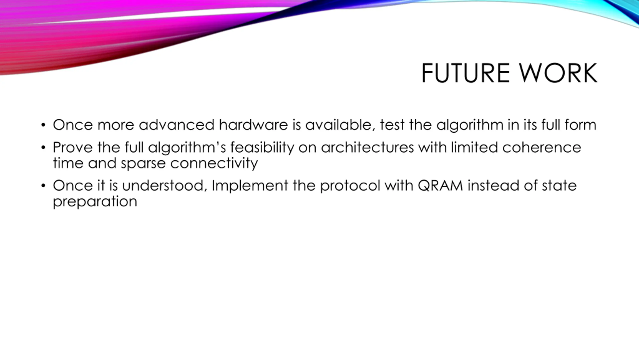 FUTURE WORK Once more advanced hardware is available, test the algorithm in its full form Prove the full algorithm s feasibility on architectures with limited coherence time and sparse connectivity Once it is understood, Implement the protocol with QRAM instead of state preparation