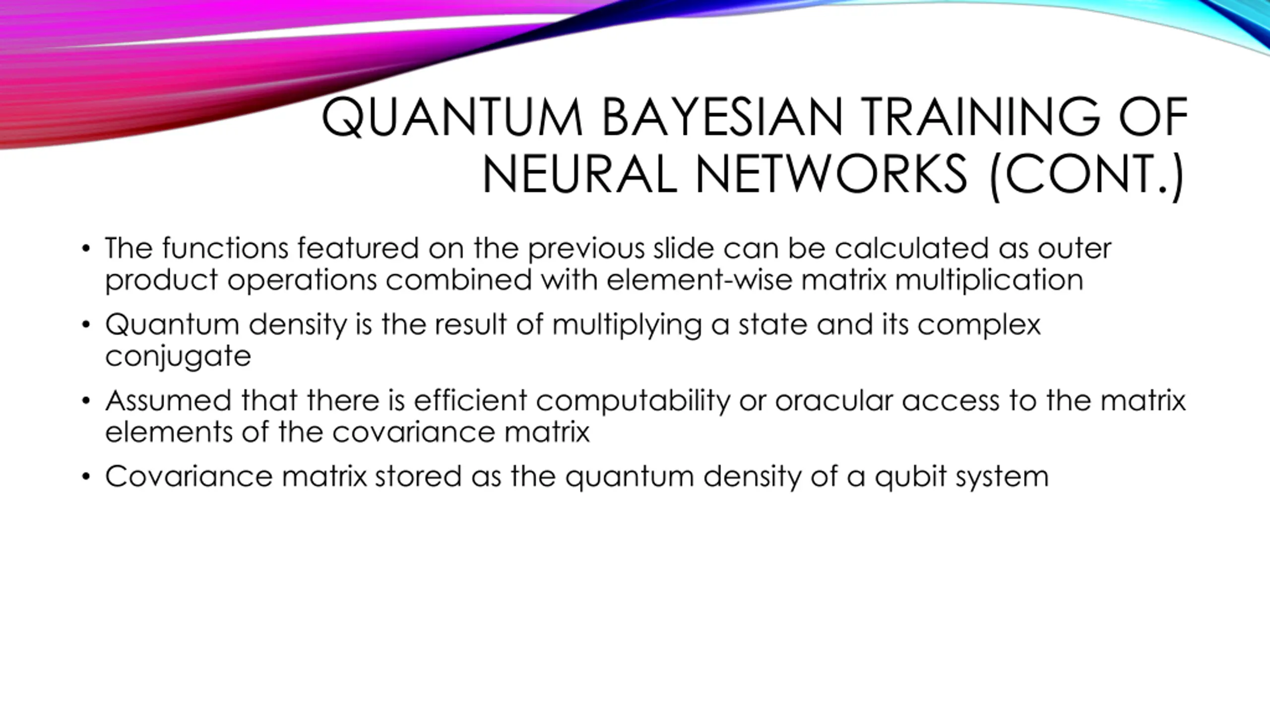 QUANTUM BAYESIAN TRAINING OF NEURAL NETWORKS (CONT.) The functions featured on the previous slide can be calculated as outer product operations combined with element-wise matrix multiplication Quantum density is the result of multiplying a state and its complex conjugate Assumed that there is efficient computability or oracular access to the matrix elements of the covariance matrix Covariance matrix stored as the quantum density of a qubit system