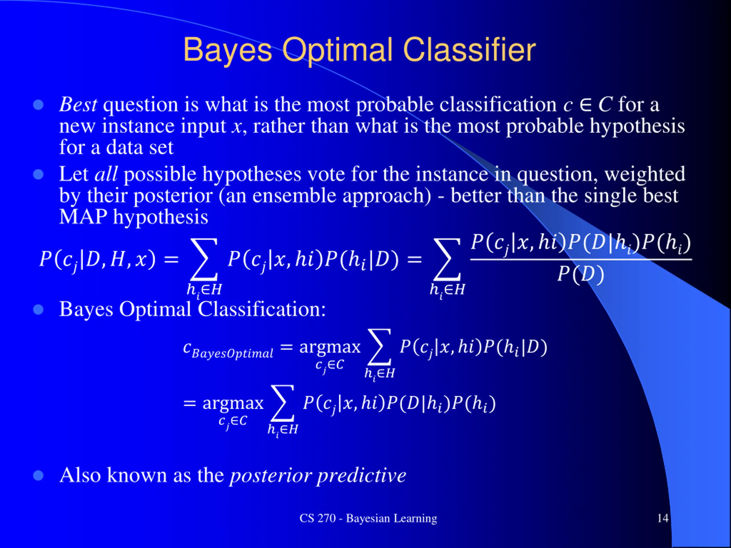 Bayes Optimal Classifier Best question is what is the most probable classification c C for a new instance input x, rather than what is the most probable hypothesis for a data set Let all possible hypotheses vote for the instance in question, weighted by their posterior (an ensemble approach) - better than the single best MAP hypothesis Also known as the posterior predictive CS 270 - Bayesian Learning 15