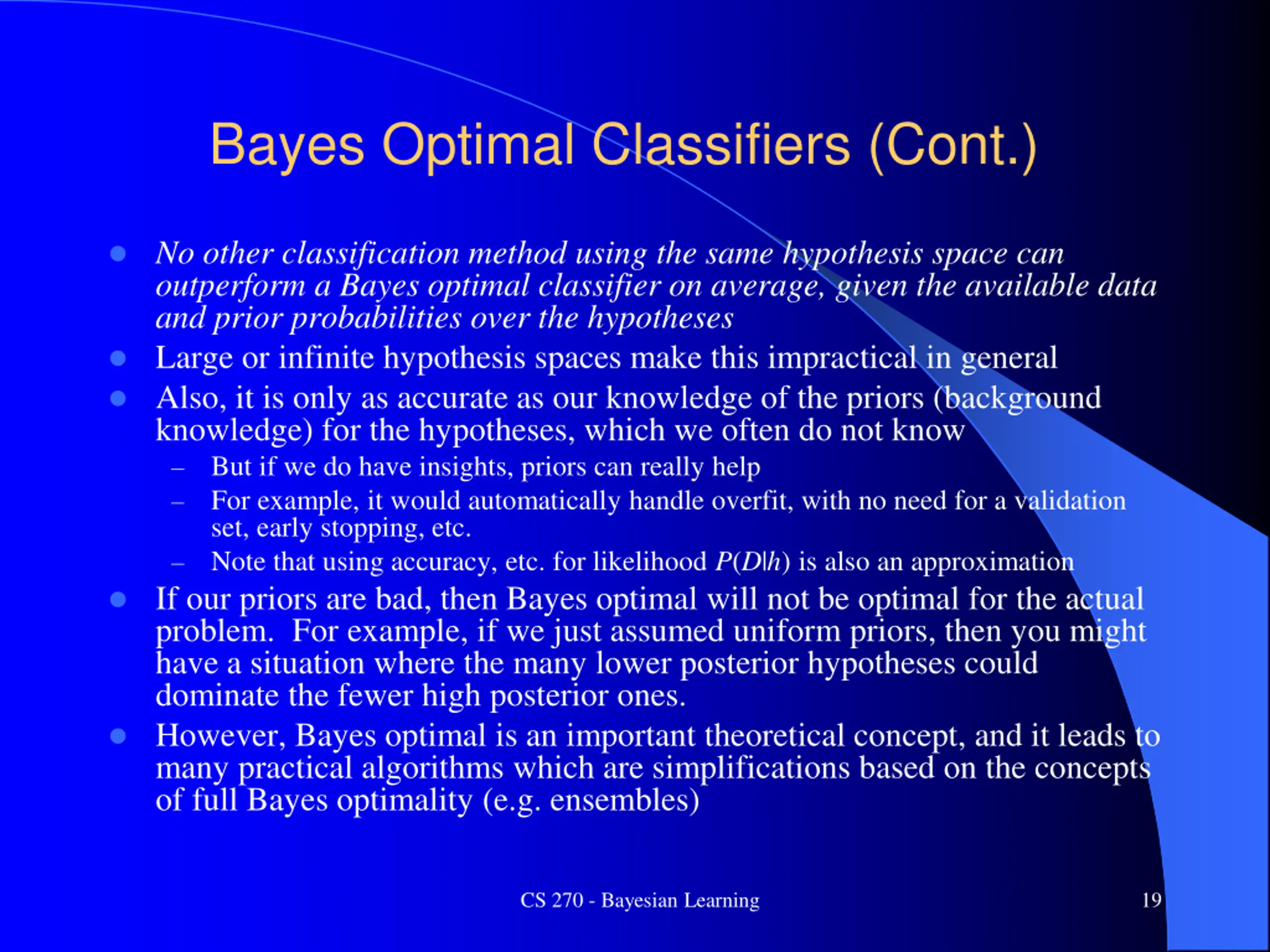 Bayes Optimal Classifiers (Cont.) No other classification method using the same hypothesis space can outperform a Bayes optimal classifier on average, given the available data and prior probabilities over the hypotheses Large or infinite hypothesis spaces make this impractical in general Also, it is only as accurate as our knowledge of the priors (background knowledge) for the hypotheses, which we often do not know But if we do have insights, priors can really help For example, it would automatically handle overfit, with no need for a validation set, early stopping, etc. Note that using accuracy, etc. for likelihood P(D|h) is also an approximation If our priors are bad, then Bayes optimal will not be optimal for the actual problem. For example, if we just assumed uniform priors, then you might have a situation where the many lower posterior hypotheses could dominate the fewer high posterior ones. However, Bayes optimal is an important theoretical concept, and it leads to many practical algorithms which are simplifications based on the concepts of full Bayes optimality (e.g. ensembles) CS 270 - Bayesian Learning 19