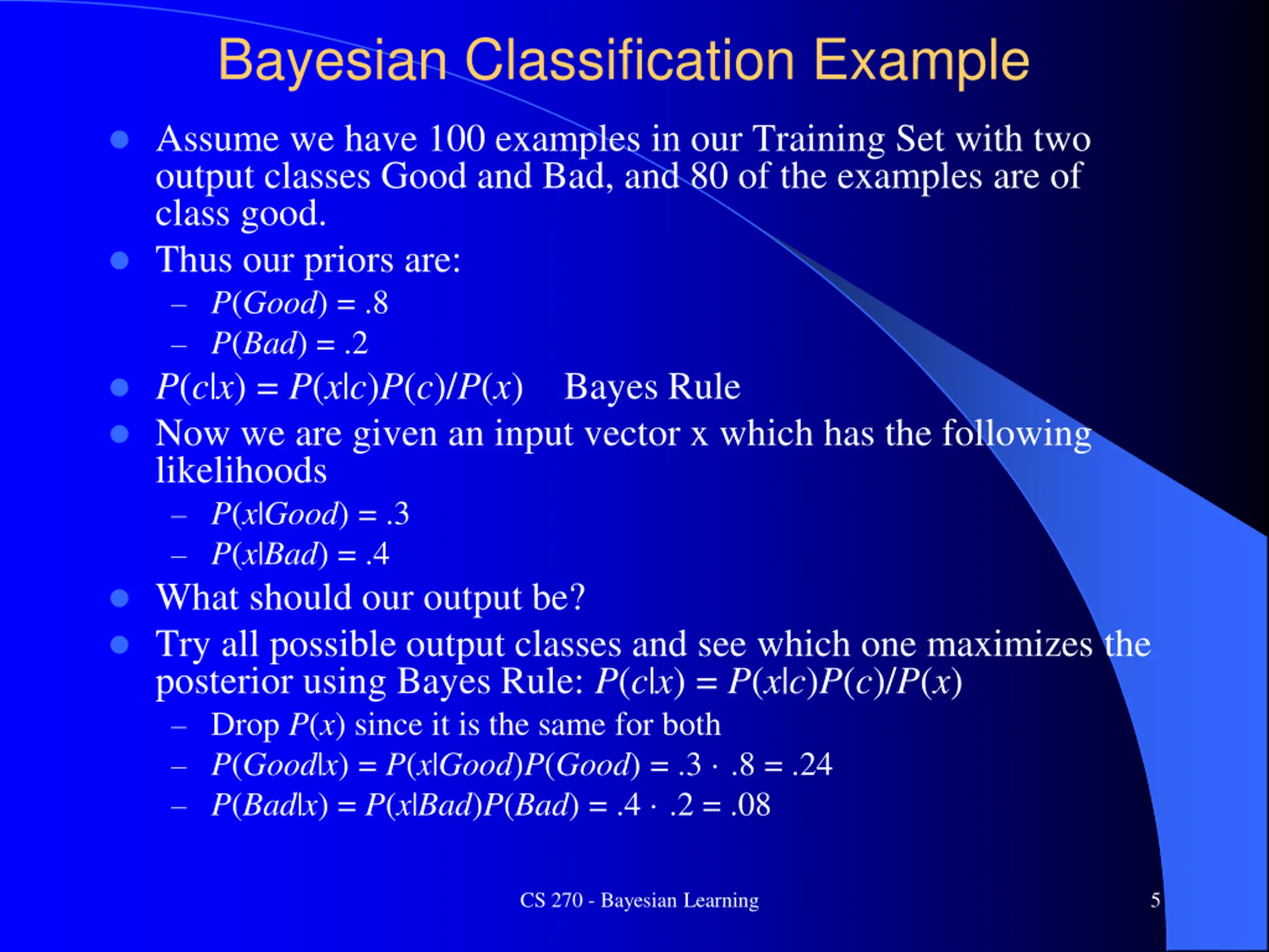 Bayesian Classification Example Assume we have 100 examples in our Training Set with two output classes Good and Bad, and 80 of the examples are of class good. Thus our priors are: P(Good) = .8 P(Bad) = .2 P(c|x) = P(x|c)P(c)/P(x) Bayes Rule Now we are given an input vector x which has the following likelihoods P(x|Good) = .3 P(x|Bad) = .4 What should our output be? CS 270 - Bayesian Learning 4