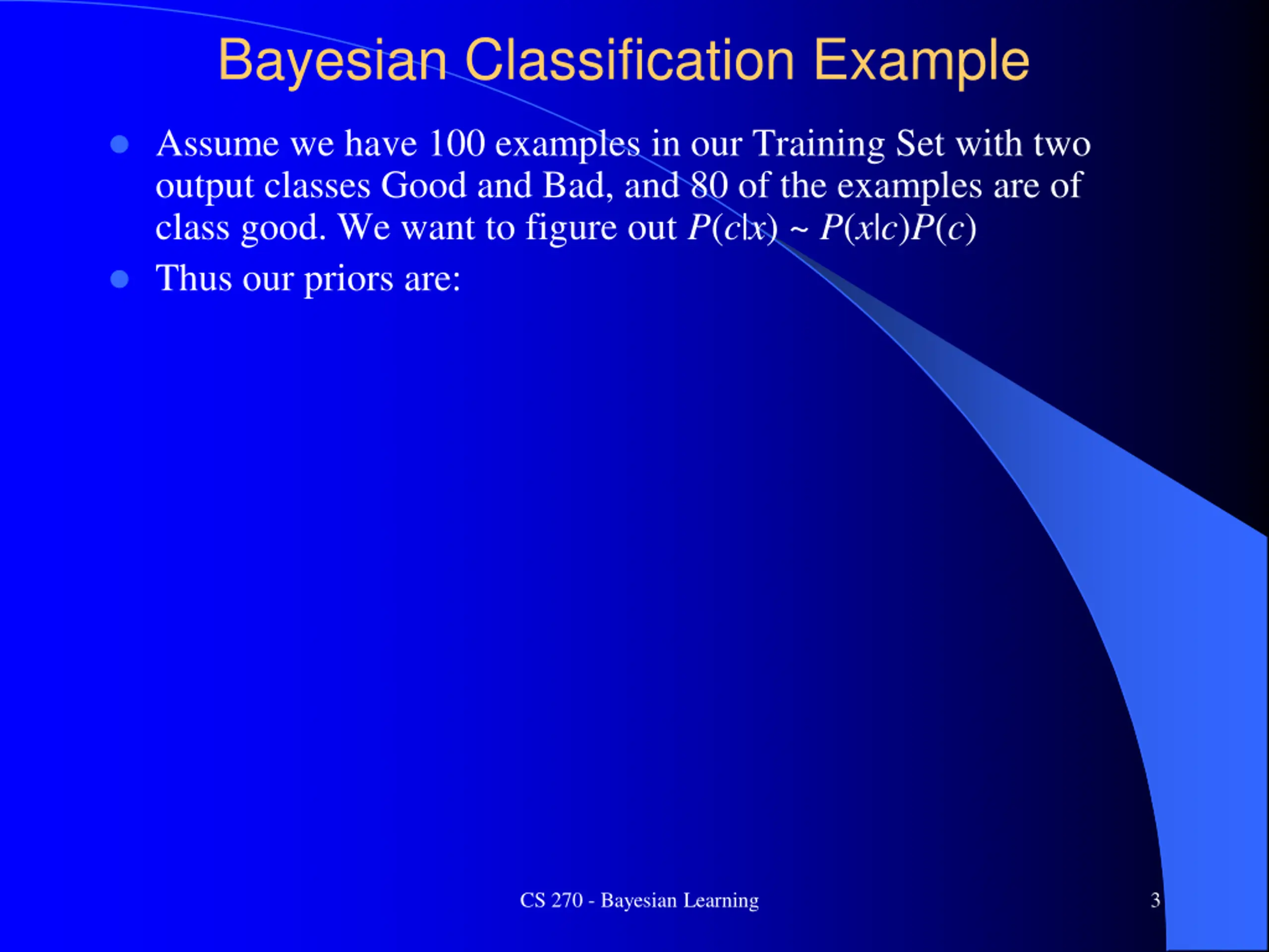 Bayesian Classification Example Assume we have 100 examples in our Training Set with two output classes Good and Bad, and 80 of the examples are of class good. We want to figure out P(c|x) ~ P(x|c)P(c) Thus our priors are: CS 270 - Bayesian Learning 3