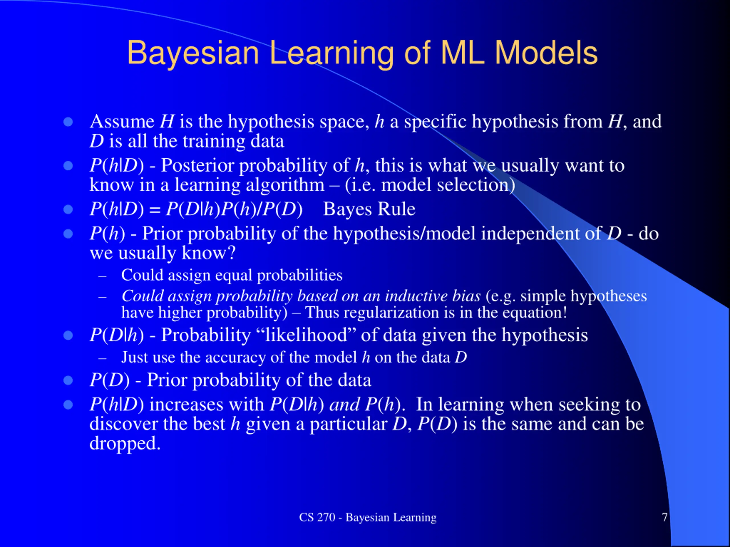 Bayesian Learning of ML Models Assume H is the hypothesis space, h a specific hypothesis from H, and D is all the training data P(h|D) - Posterior probability of h, this is what we usually want to know in a learning algorithm (i.e. model selection) P(h|D) = P(D|h)P(h)/P(D) Bayes Rule P(h) - Prior probability of the hypothesis/model independent of D - do we usually know? Could assign equal probabilities Could assign probability based on an inductive bias (e.g. simple hypotheses have higher probability) Thus regularization is in the equation! P(D|h) - Probability likelihood of data given the hypothesis Just use the accuracy of the model h on the data D P(D) - Prior probability of the data P(h|D) increases with P(D|h) and P(h). In learning when seeking to discover the best h given a particular D, P(D) is the same and can be dropped. CS 270 - Bayesian Learning 7