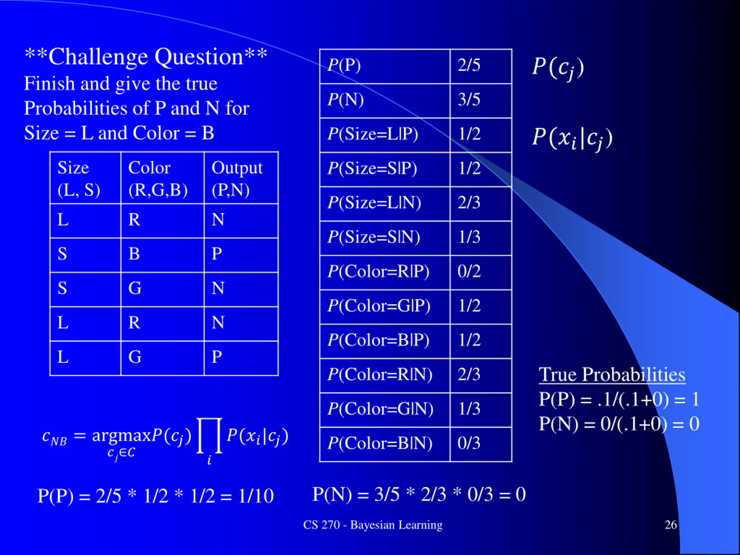 **Challenge Question** Finish and give the true Probabilities of P and N for Size = L and Color = B ?(??) P(P) 2/5 P(N) 3/5 ?(??|??) P(Size=L|P) 1/2 Size (L, S) L Color (R,G,B) R Output (P,N) N P(Size=S|P) 1/2 P(Size=L|N) 2/3 P(Size=S|N) S B P P(Color=R|P) S G N P(Color=G|P) L R N P(Color=B|P) L G P P(Color=R|N) P(Color=G|N) ???= argmax ?(??) ?(??|??) P(Color=B|N) ?? ? ? P(N) = ? P(P) = 2/5 * 1/2 * P(Color = B|P) = ? CS 270 - Bayesian Learning 25