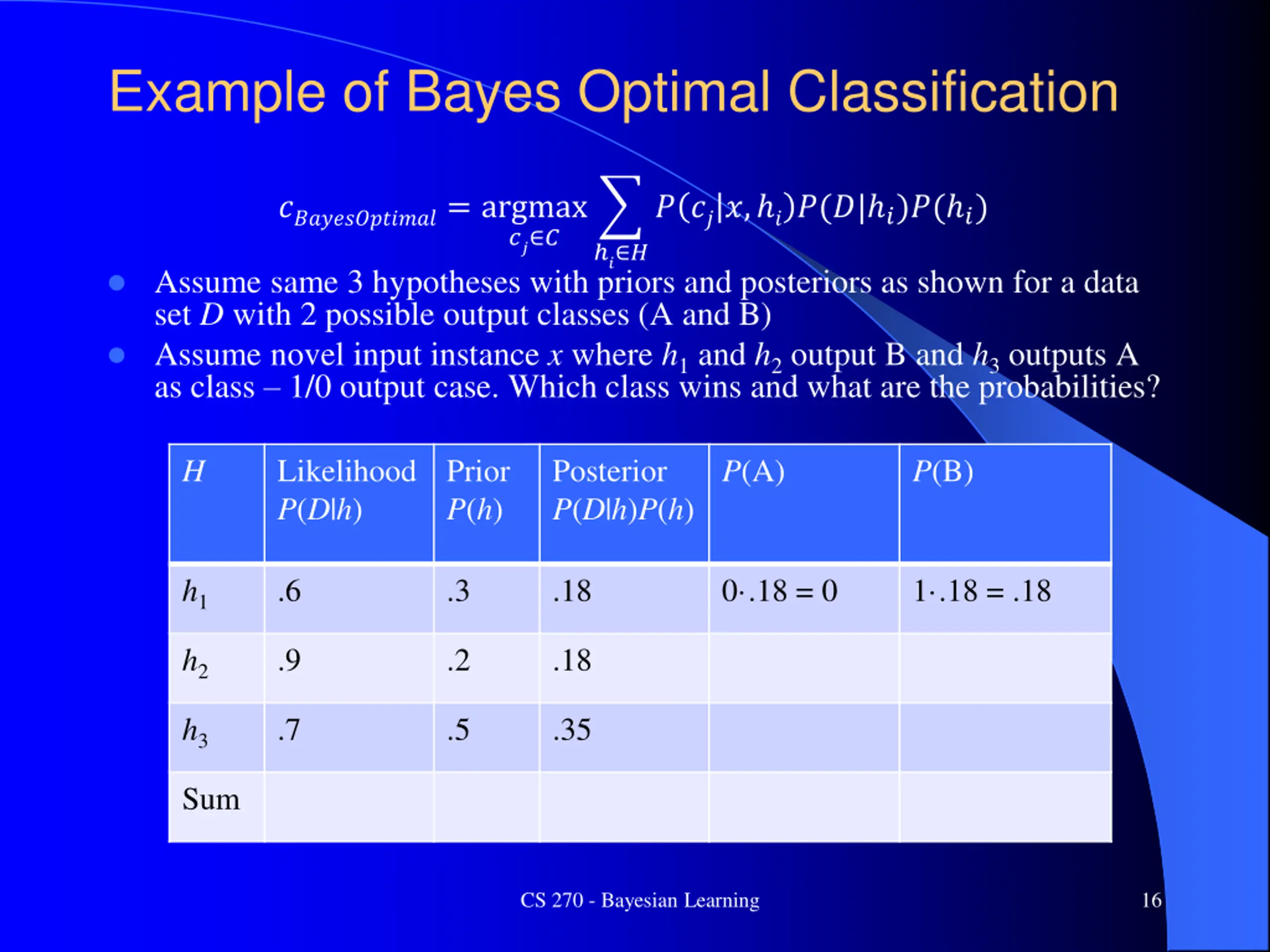 Example of Bayes Optimal Classification Assume probabilistic outputs from the hypotheses for new a instance x H P(A) P(B) .3 .7 h1 h2 h3 .4 .6 .9 .1 Likelihood P(D|h) Prior P(h) Posterior P(D|h)P(h) P(A) P(B) H .6 .3 .18 .3 .18 = .054 .7 .18 = .126 h1 .9 .2 .18 .4 .18 = .072 .6 .18 = .108 h2 .7 .5 .35 .9 .35 = .315 .1 .35 = .035 h3 Sum .441 .269 CS 270 - Bayesian Learning 18