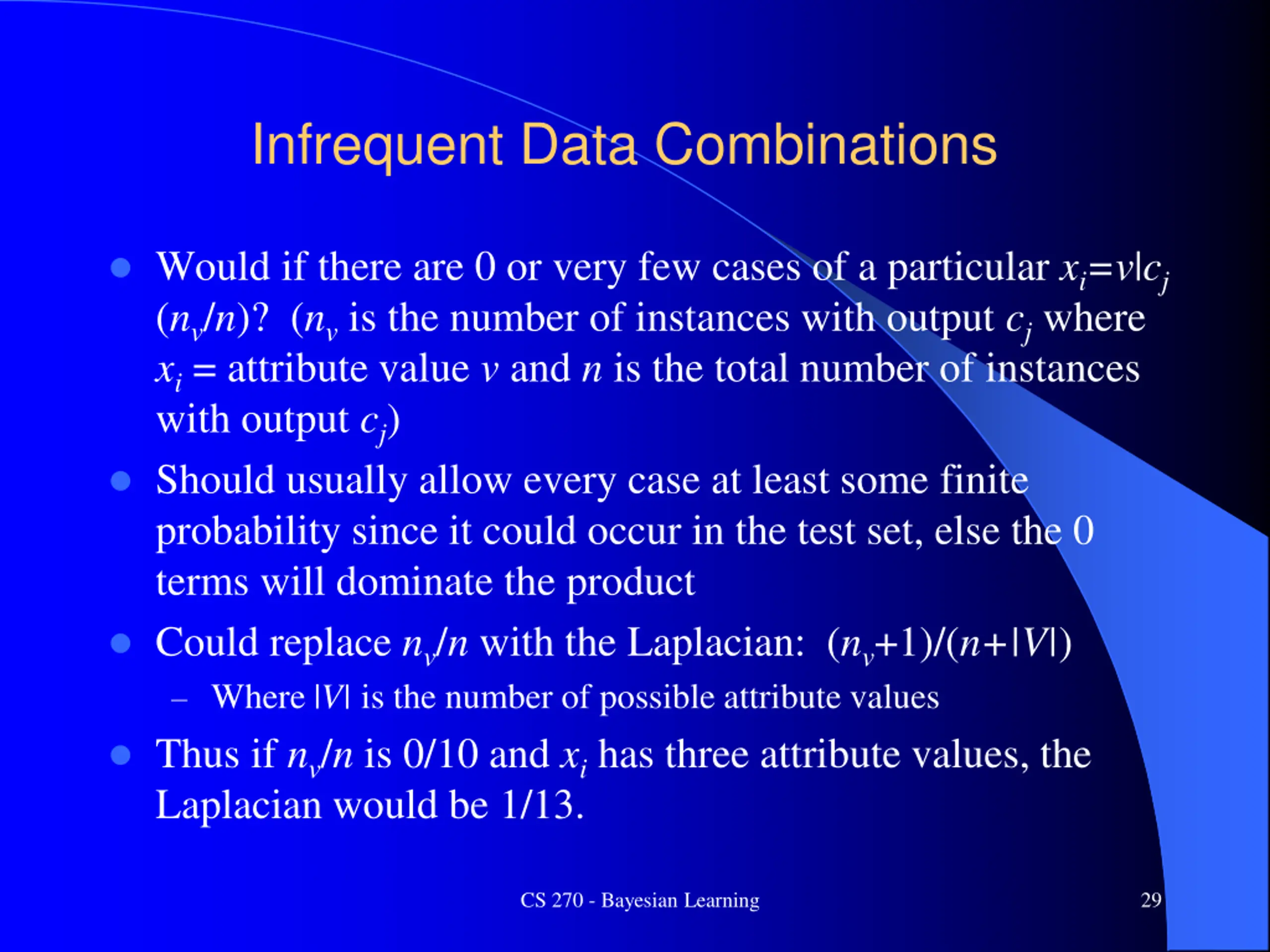 Infrequent Data Combinations Would if there are 0 or very few cases of a particular xi=v|cj (nv/n)? (nv is the number of instances with output cj where xi = attribute value v and n is the total number of instances with output cj) Should usually allow every case at least some finite probability since it could occur in the test set, else the 0 terms will dominate the product Could replace nv/n with the Laplacian:(nv+1)/(n+|V|) Where |V| is the number of possible attribute values Thus if nv/n is 0/10 and xi has three attribute values, the Laplacian would be 1/13. CS 270 - Bayesian Learning 29