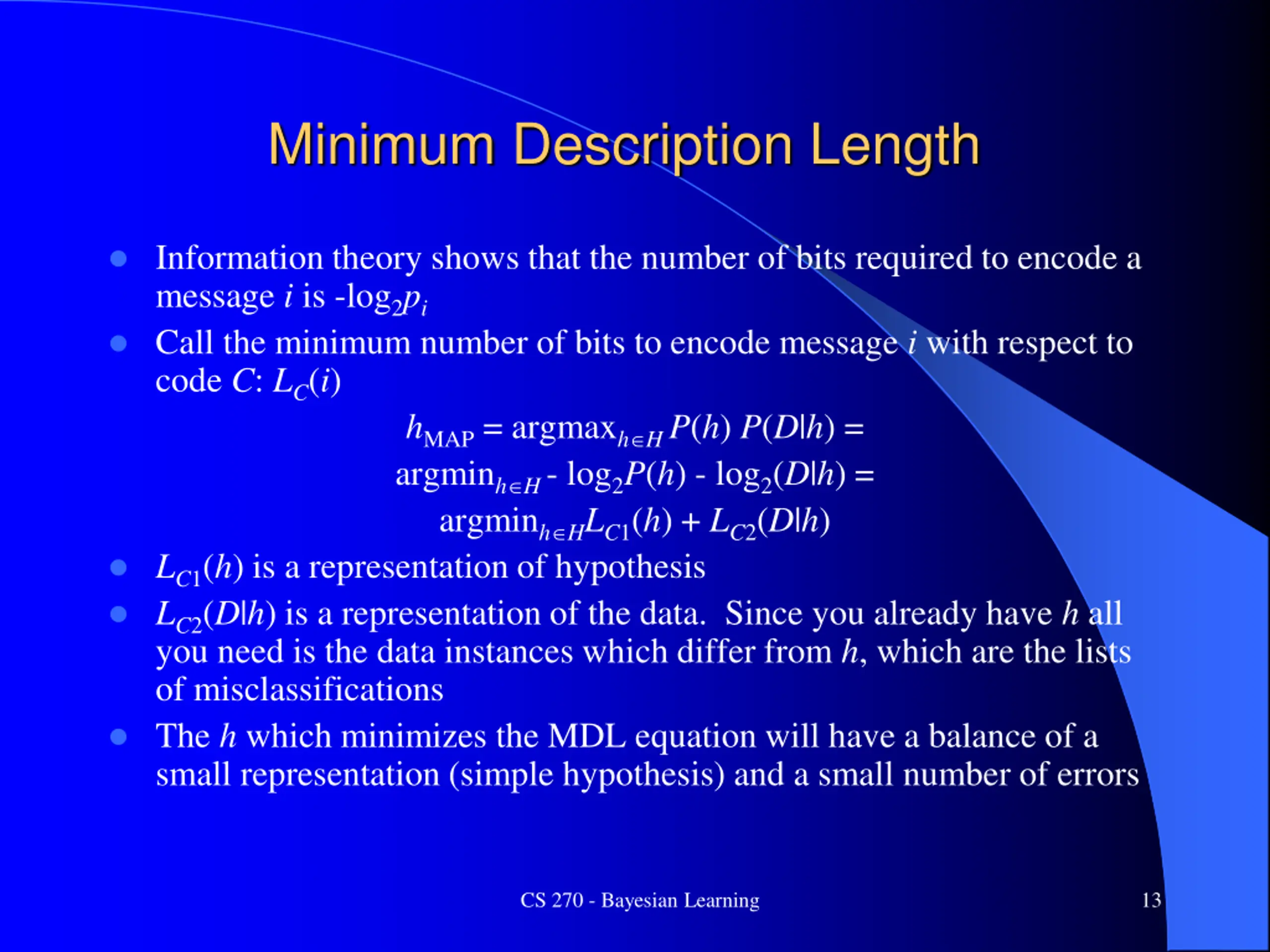 Minimum Description Length Information theory shows that the number of bits required to encode a message i is -log2pi Call the minimum number of bits to encode message i with respect to code C: LC(i) hMAP = argmaxh H P(h) P(D|h)= argminh H - log2P(h) - log2(D|h) = argminh HLC1(h) + LC2(D|h) LC1(h) is a representation of hypothesis LC2(D|h) is a representation of the data. Since you already have h all you need is the data instances which differ from h, which are the lists of misclassifications The h which minimizes the MDL equation will have a balance of a small representation (simple hypothesis) and a small number of errors CS 270 - Bayesian Learning 13