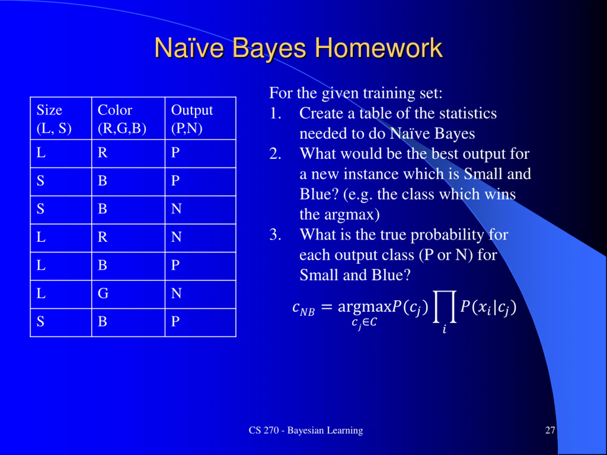 ?(??) P(P) P(N) ?(??|??) P(Size=L|P) Size (L, S) L Color (R,G,B) R Output (P,N) N P(Size=S|P) P(Size=L|N) P(Size=S|N) S B P P(Color=R|P) S G N P(Color=G|P) L R N P(Color=B|P) L G P P(Color=R|N) P(Color=G|N) ???= argmax ?(??) ?(??|??) P(Color=B|N) ?? ? ? CS 270 - Bayesian Learning 24