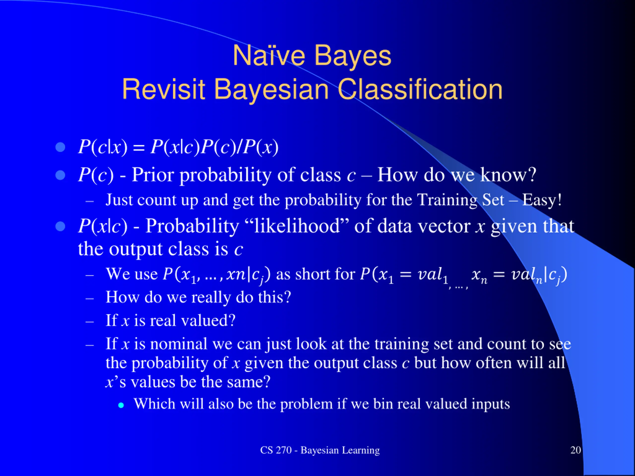 Nave Bayes Revisit Bayesian Classification P(c|x) = P(x|c)P(c)/P(x) P(c) - Prior probability of class c How do we know? Just count up and get the probability for the Training Set Easy! P(x|c) - Probability likelihood of data vector x given that the output class is c We use ? ?1, ,?? ?? as short for ? ?1= ???1, ,??= ?????? How do we really do this? If x is real valued? If x is nominal we can just look at the training set and count to see the probability of x given the output class c but how often will all x s values be the same? Which will also be the problem if we bin real valued inputs CS 270 - Bayesian Learning 20