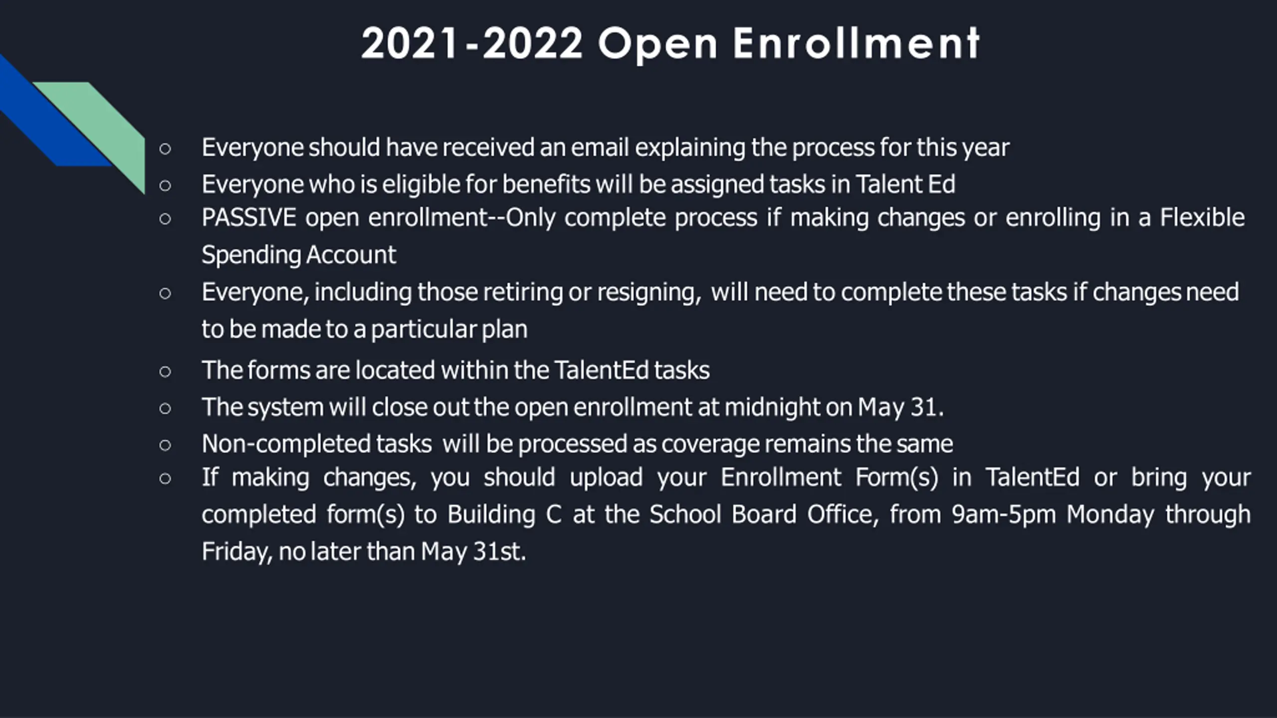 2021-2022 Open Enrollment Everyoneshould havereceivedanemail explaining the process for thisyear Everyonewho is eligible for benefitswill beassignedtasks in Talent Ed PASSIVE open enrollment--Only complete process if making changes or enrolling in a Flexible SpendingAccount Everyone,including thoseretiringor resigning, will needto completethesetasks if changesneed tobemadeto aparticularplan Theformsare located withintheTalentEdtasks Thesystemwill close outthe openenrollment at midnight onMay 31. Non-completed tasks will be processed ascoverageremains thesame If making changes, you should upload your Enrollment Form(s) in TalentEd or bring your completed form(s) to Building C at the School Board Office, from 9am-5pm Monday through Friday,nolater thanMay 31st.