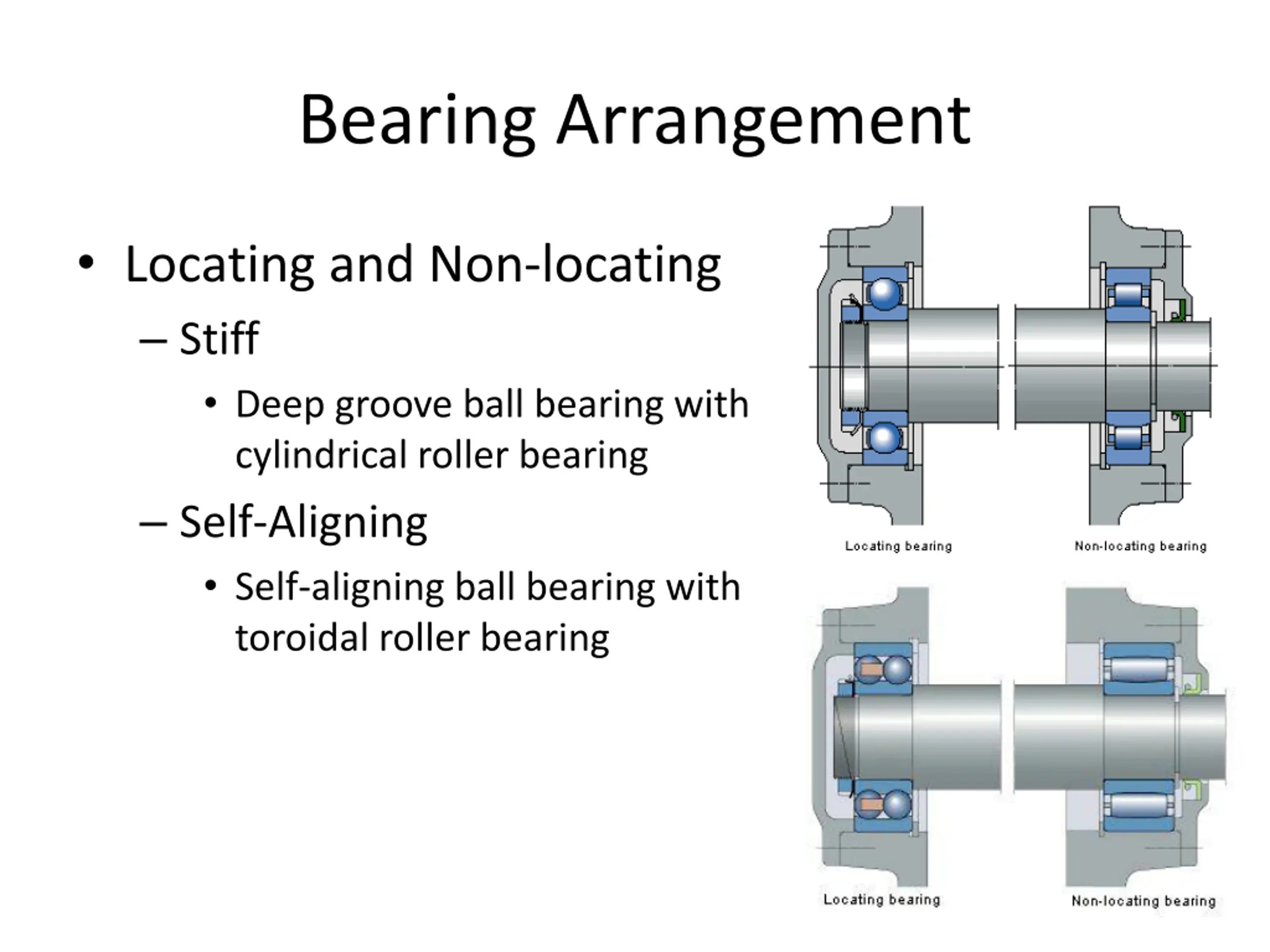 Bearing Arrangement Locating and Non-locating Stiff Deep groove ball bearing with cylindrical roller bearing Self-Aligning Self-aligning ball bearing with toroidal roller bearing