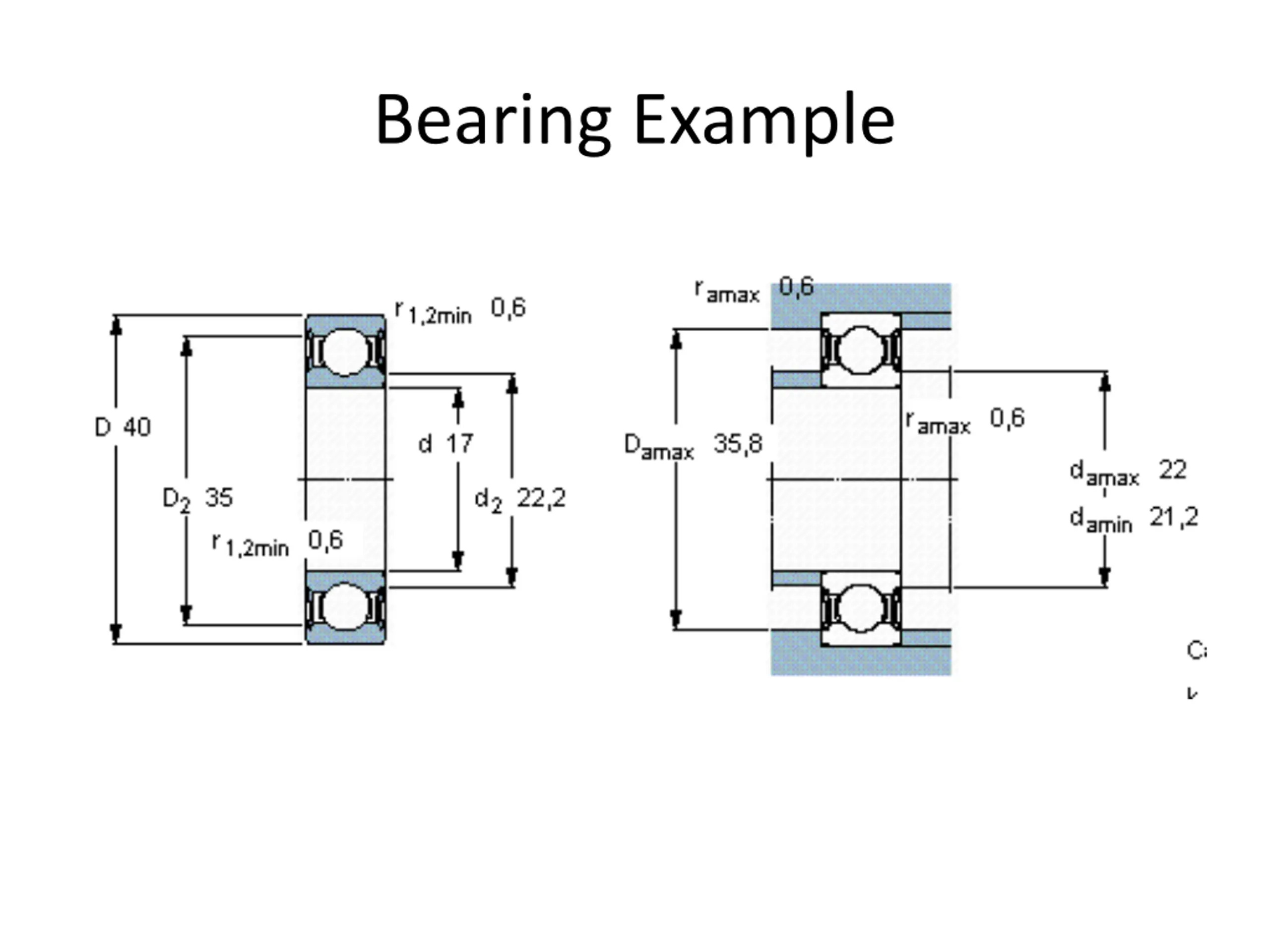 Bearing Load Dynamic Load to failure after 1,000,000 revolutions (ISO 281:1990) Shows metal fatigue (flaking, spalling) on rings or rolling elements Static Rotate at slow speeds (< 10 RPM) Perform very slow oscillating movements Stationary under load for certain extended periods