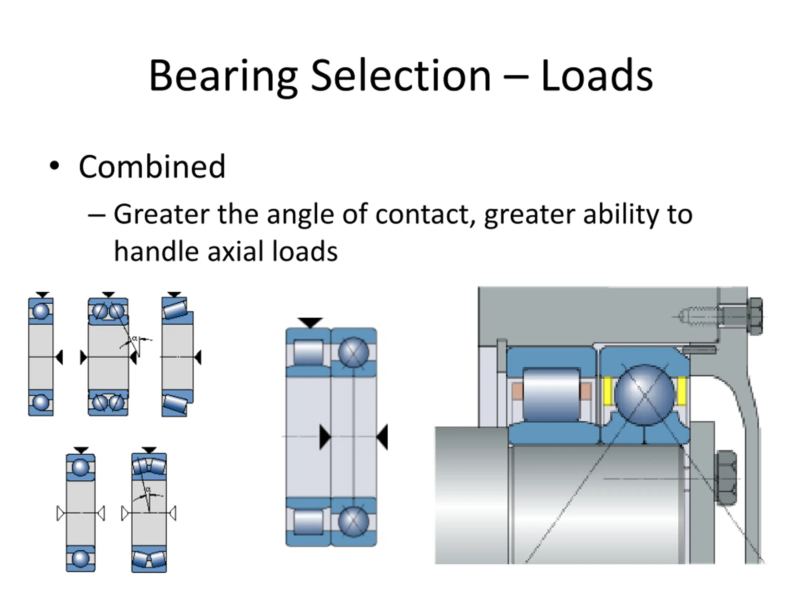 Bearing Selection Loads Combined Greater the angle of contact, greater ability to handle axial loads