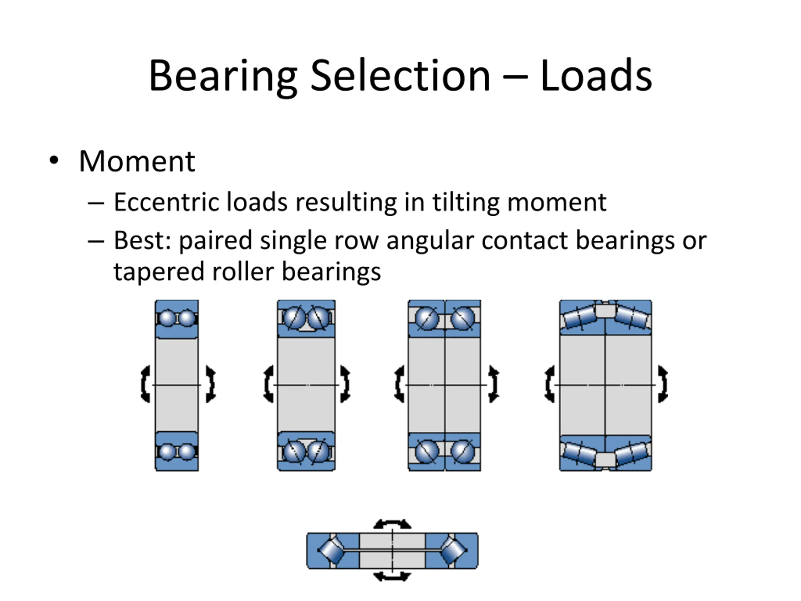 Bearing Selection Loads Moment Eccentric loads resulting in tilting moment Best: paired single row angular contact bearings or tapered roller bearings