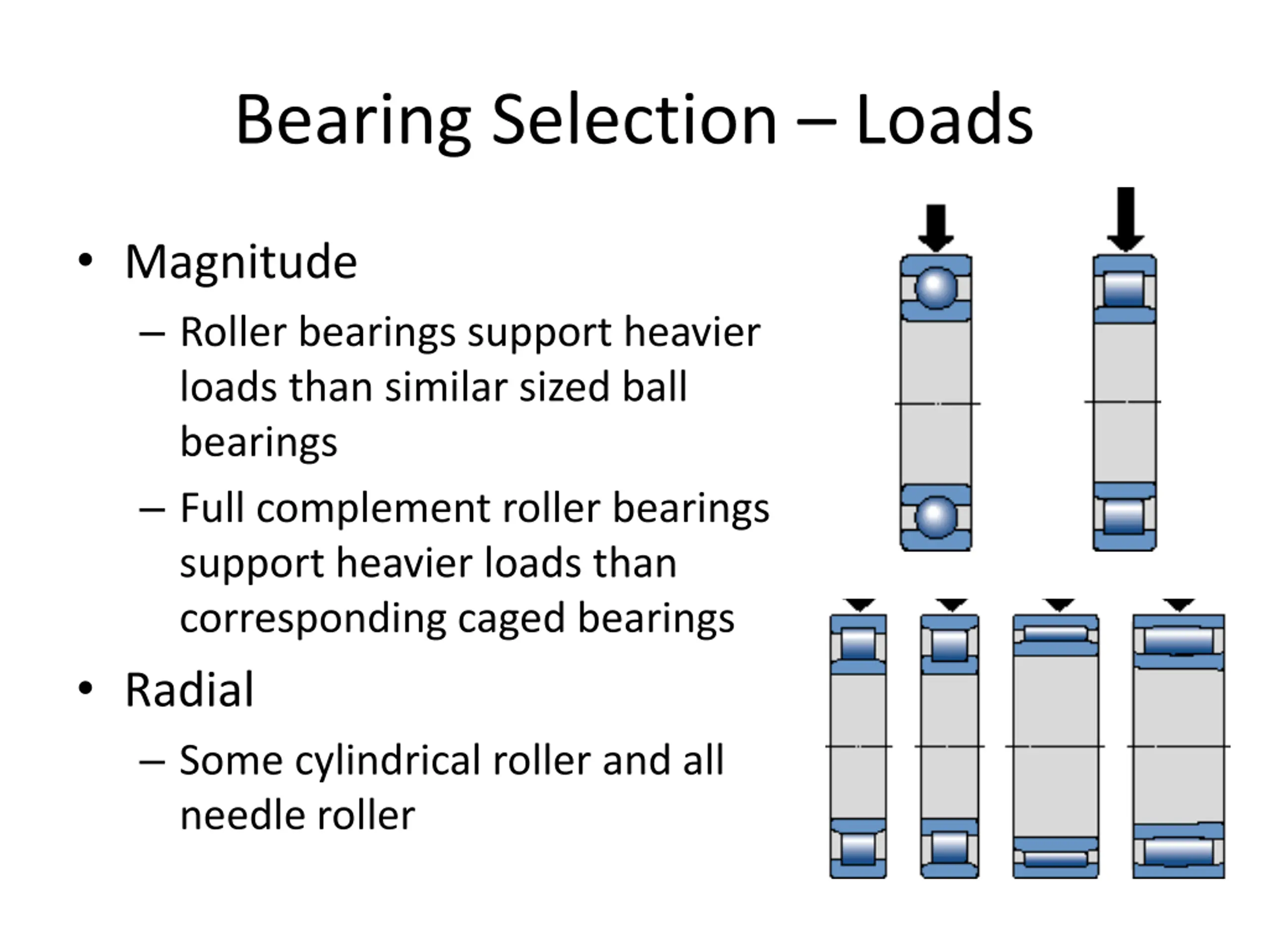 Bearing Selection Loads Magnitude Roller bearings support heavier loads than similar sized ball bearings Full complement roller bearings support heavier loads than corresponding caged bearings Radial Some cylindrical roller and all needle roller