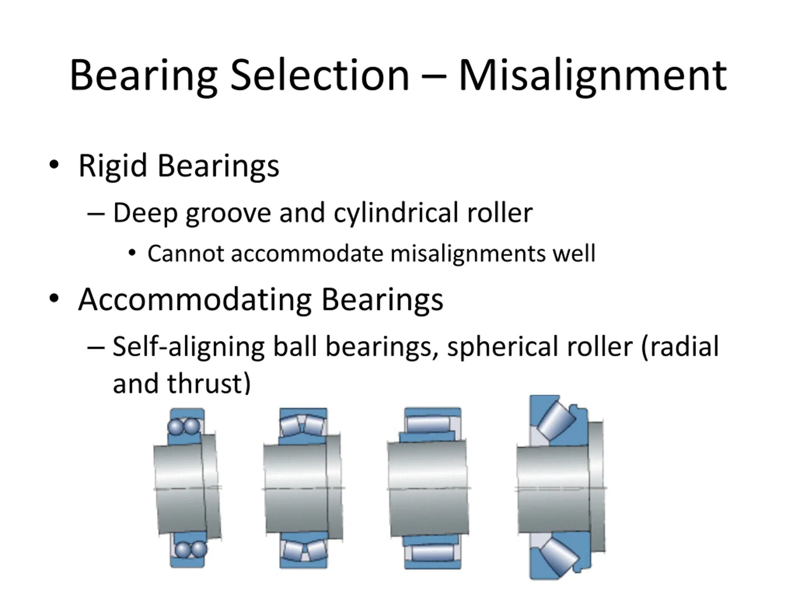 Bearing Selection Misalignment Rigid Bearings Deep groove and cylindrical roller Cannot accommodate misalignments well Accommodating Bearings Self-aligning ball bearings, spherical roller (radial and thrust)