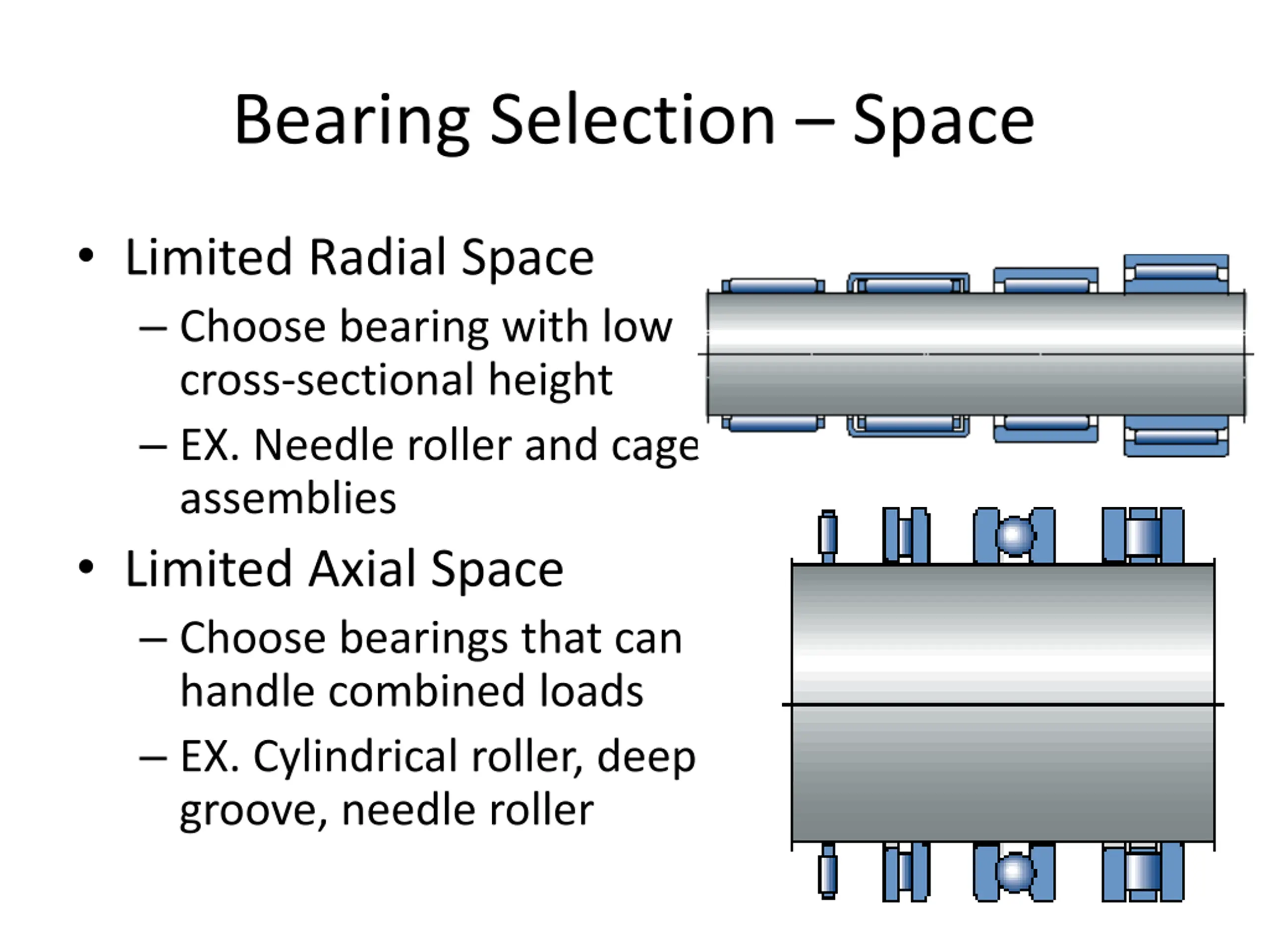 Bearing Selection Space Limited Radial Space Choose bearing with low cross-sectional height EX. Needle roller and cage assemblies Limited Axial Space Choose bearings that can handle combined loads EX. Cylindrical roller, deep groove, needle roller