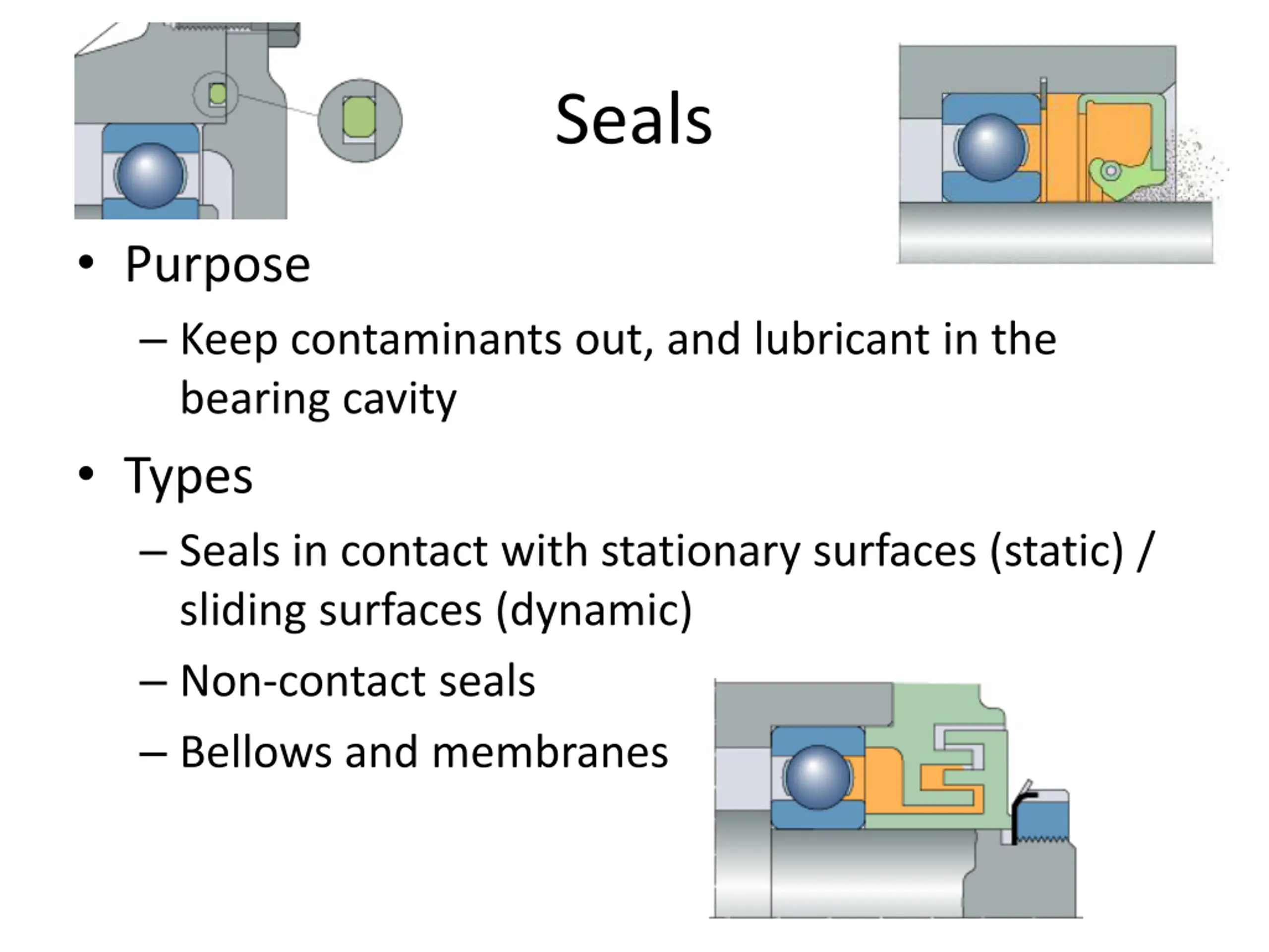 Seals Purpose Keep contaminants out, and lubricant in the bearing cavity Types Seals in contact with stationary surfaces (static) / sliding surfaces (dynamic) Non-contact seals Bellows and membranes
