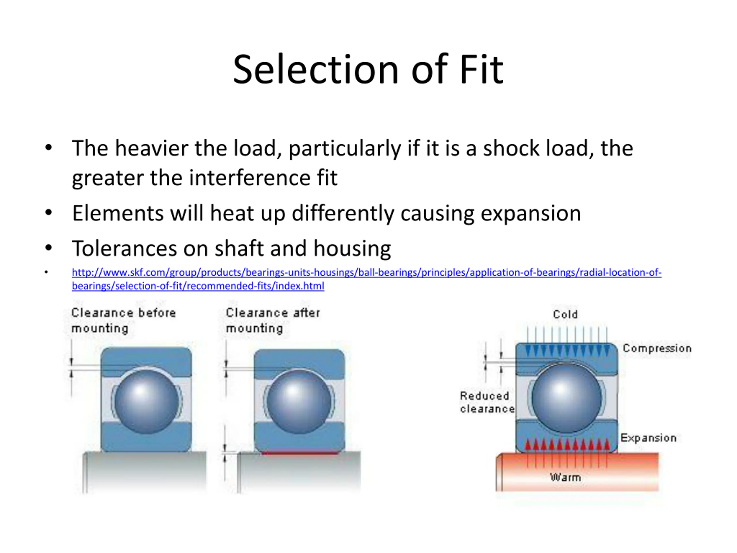 Selection of Fit The heavier the load, particularly if it is a shock load, the greater the interference fit Elements will heat up differently causing expansion Tolerances on shaft and housing http://www.skf.com/group/products/bearings-units-housings/ball-bearings/principles/application-of-bearings/radial-location-of- bearings/selection-of-fit/recommended-fits/index.html