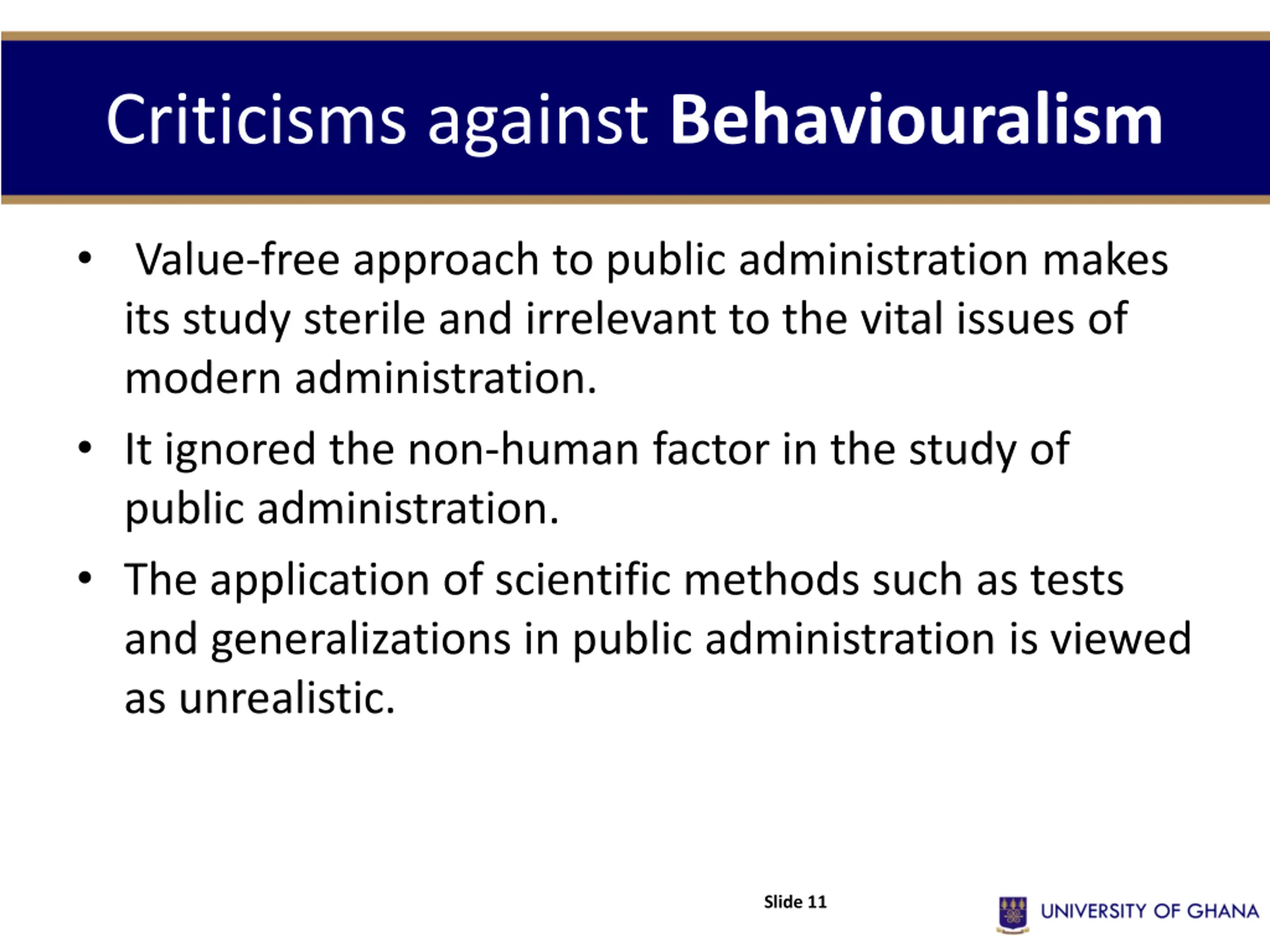 Criticisms against Behaviouralism Value-free approach to public administration makes its study sterile and irrelevant to the vital issues of modern administration. It ignored the non-human factor in the study of public administration. The application of scientific methods such as tests and generalizations in public administration is viewed as unrealistic. Slide 11
