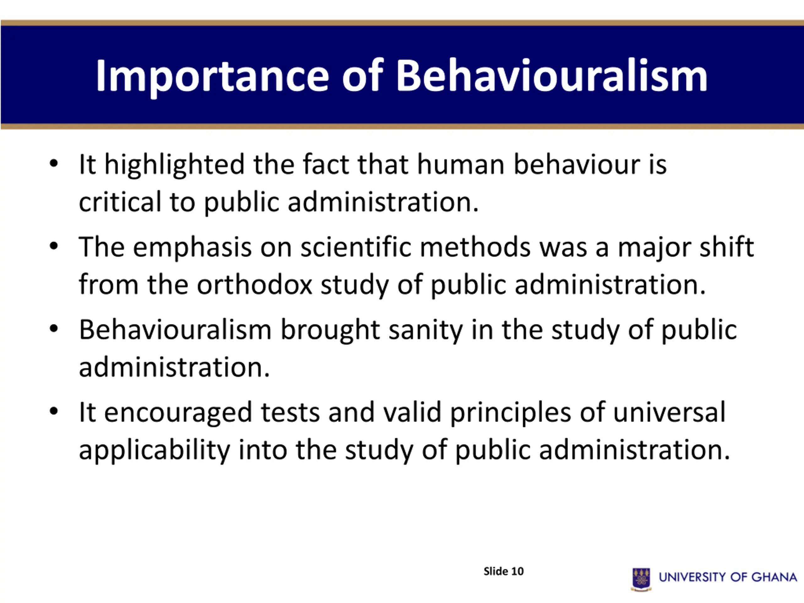 Importance of Behaviouralism It highlighted the fact that human behaviour is critical to public administration. The emphasis on scientific methods was a major shift from the orthodox study of public administration. Behaviouralism brought sanity in the study of public administration. It encouraged tests and valid principles of universal applicability into the study of public administration. Slide 10