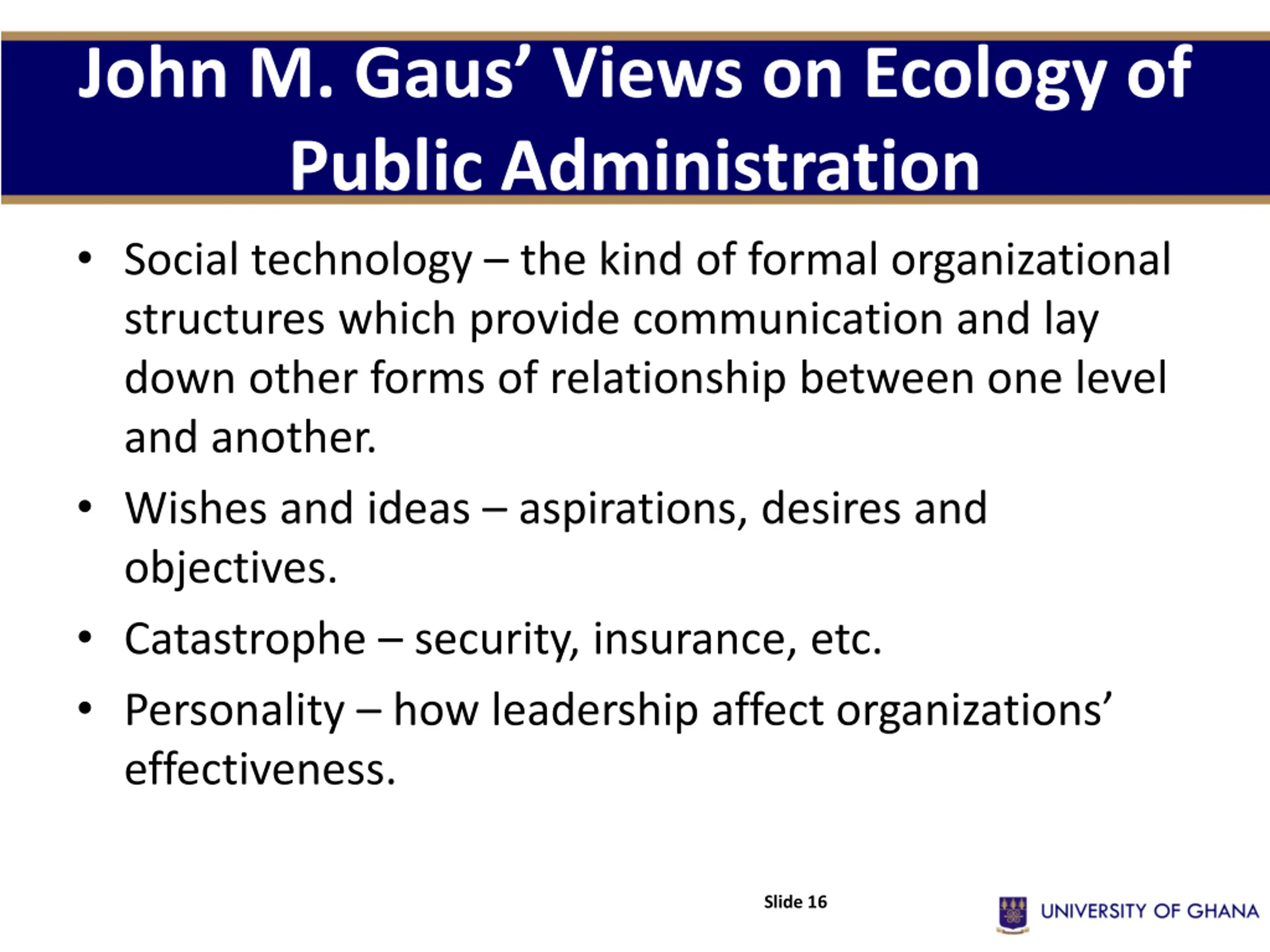 John M. Gaus Views on Ecology of Public Administration Social technology the kind of formal organizational structures which provide communication and lay down other forms of relationship between one level and another. Wishes and ideas aspirations, desires and objectives. Catastrophe security, insurance, etc. Personality how leadership affect organizations effectiveness. Slide 16