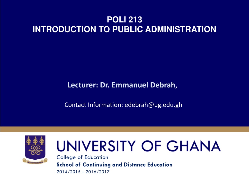 POLI 213 INTRODUCTION TO PUBLIC ADMINISTRATION Lecturer: Dr. Emmanuel Debrah, Contact Information: edebrah@ug.edu.gh College of Education School of Continuing and Distance Education 2014/2015 2016/2017