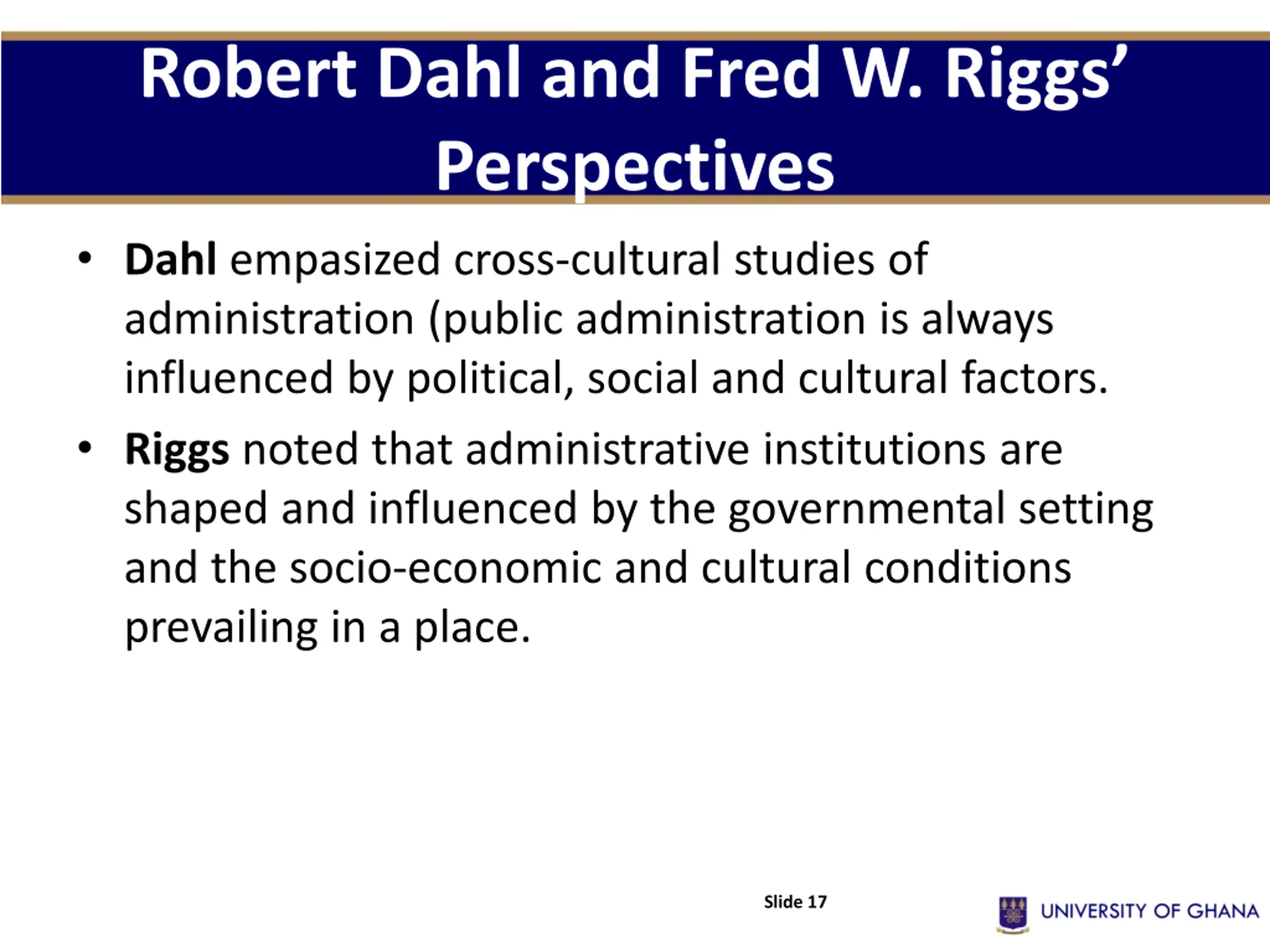 Robert Dahl and Fred W. Riggs Perspectives Dahl empasized cross-cultural studies of administration (public administration is always influenced by political, social and cultural factors. Riggs noted that administrative institutions are shaped and influenced by the governmental setting and the socio-economic and cultural conditions prevailing in a place. Slide 17